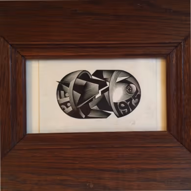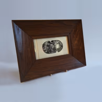 A modernist bookplate in earlier wide oak frame.
