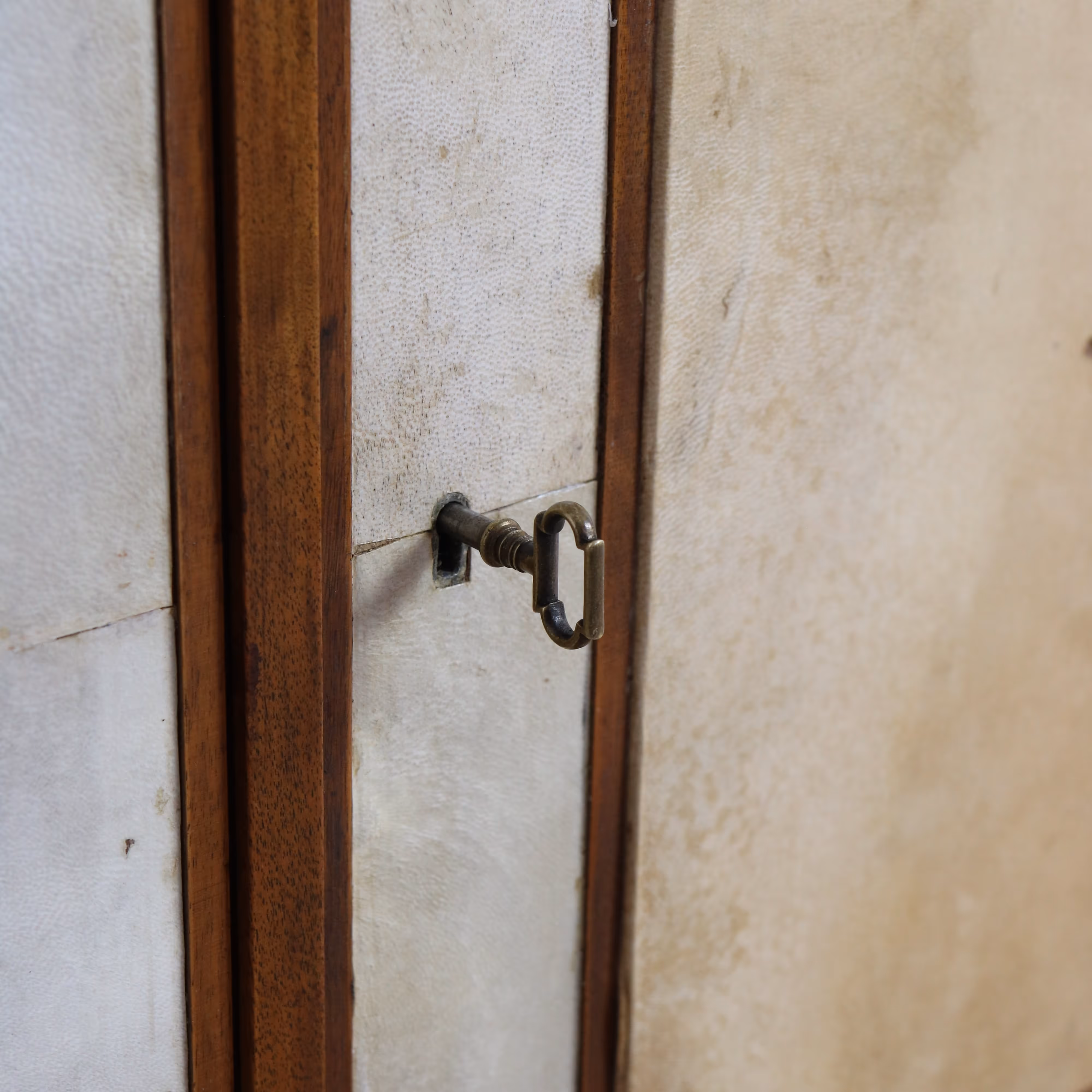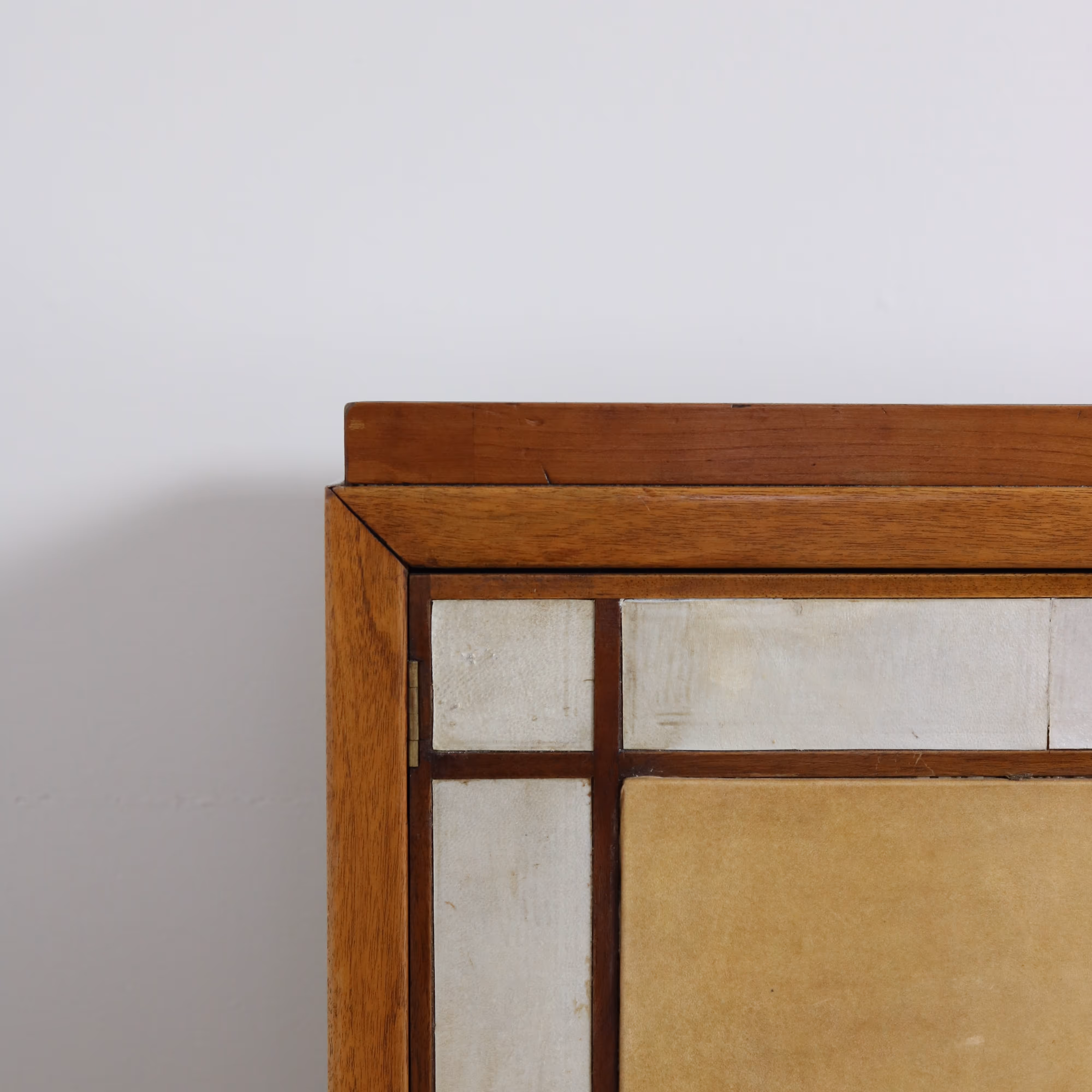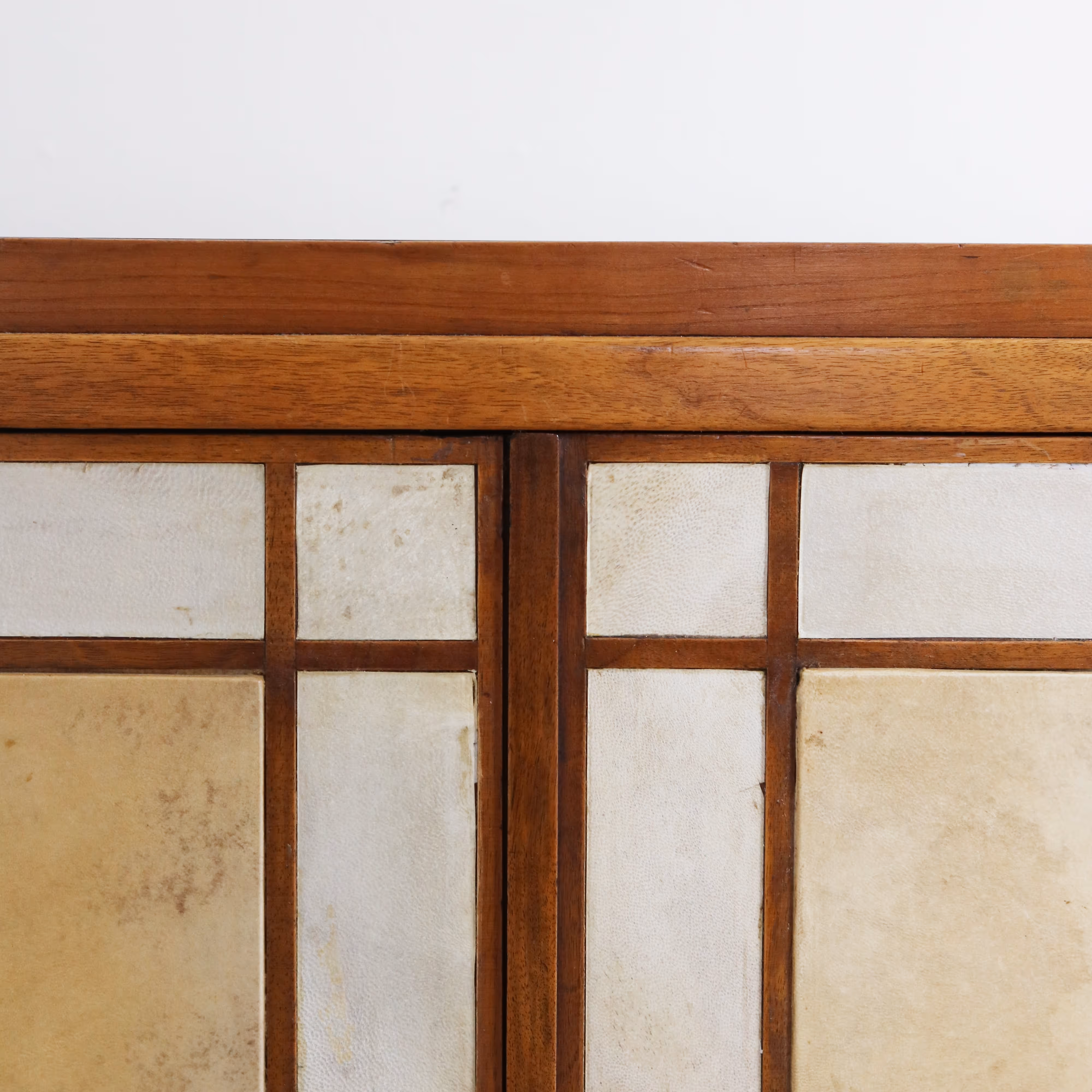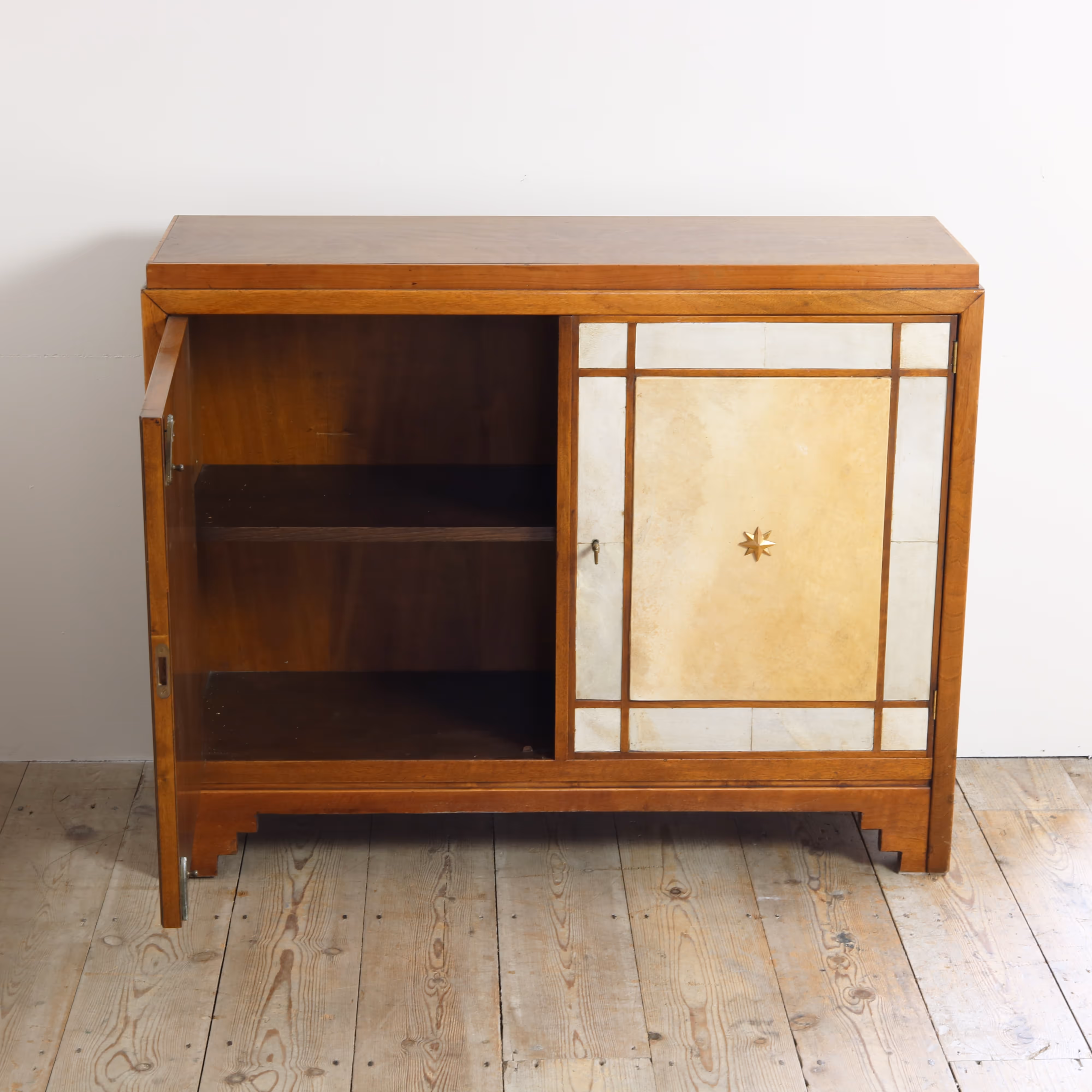 A pair of walnut side cabinets and brass star details. Recent vellum cladding, original keys.