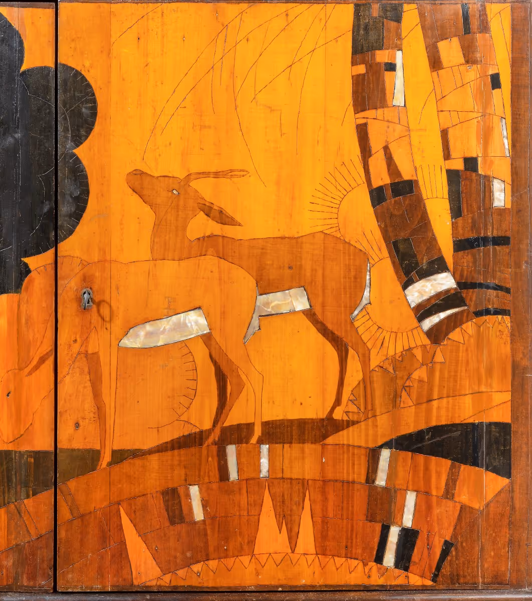 Deer, palm tree, and sun decor in various inlays, including mother of pearl.