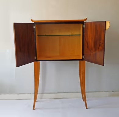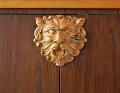 A drinks cabinet with rosewood-veneered doors, curved legs and top in maple. The front door decorated with a handcarved medallion of a grotesque head. The inside lined in maple and fitted with a glass shelf.