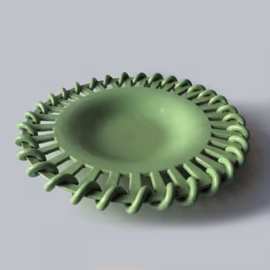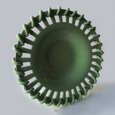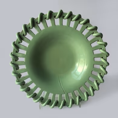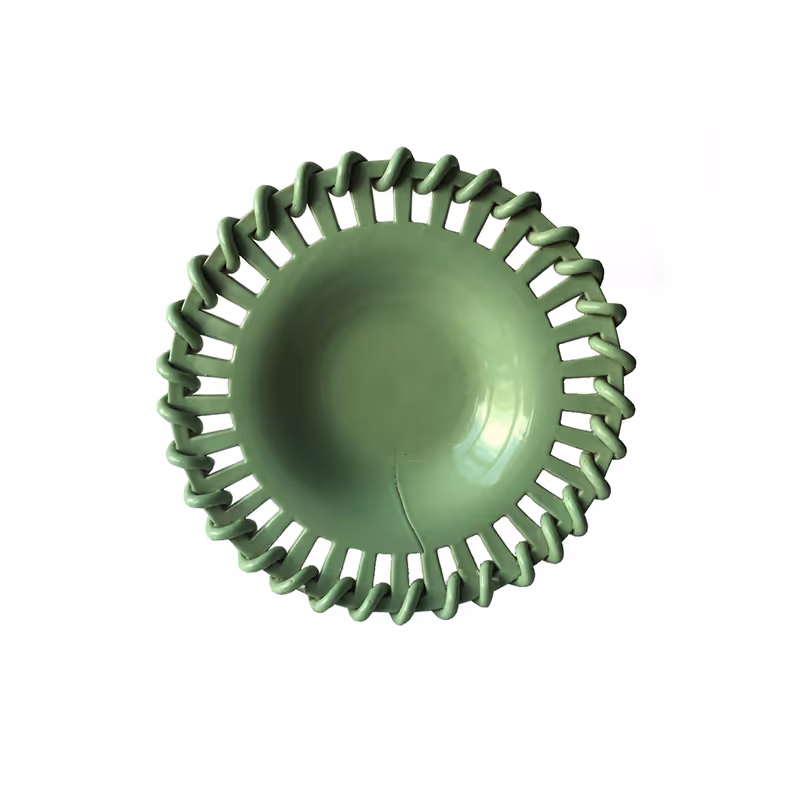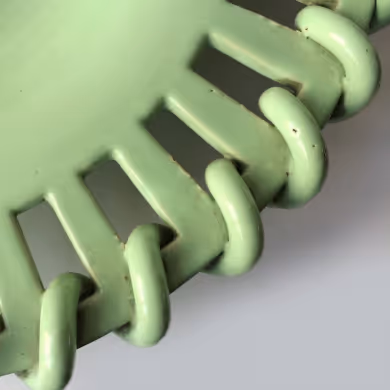 A studio pottery dish with intricate laced edge detail, light green glaze. Excellent condition, one firing defect.