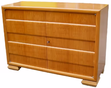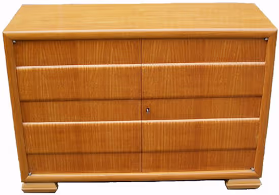 A 1940s chest with three drawers concealed behind two doors and square cushion feet. Satinwood veneer & birch interior