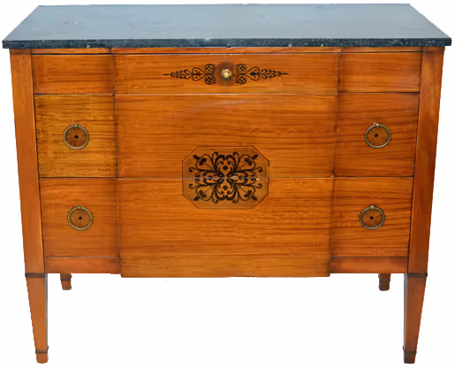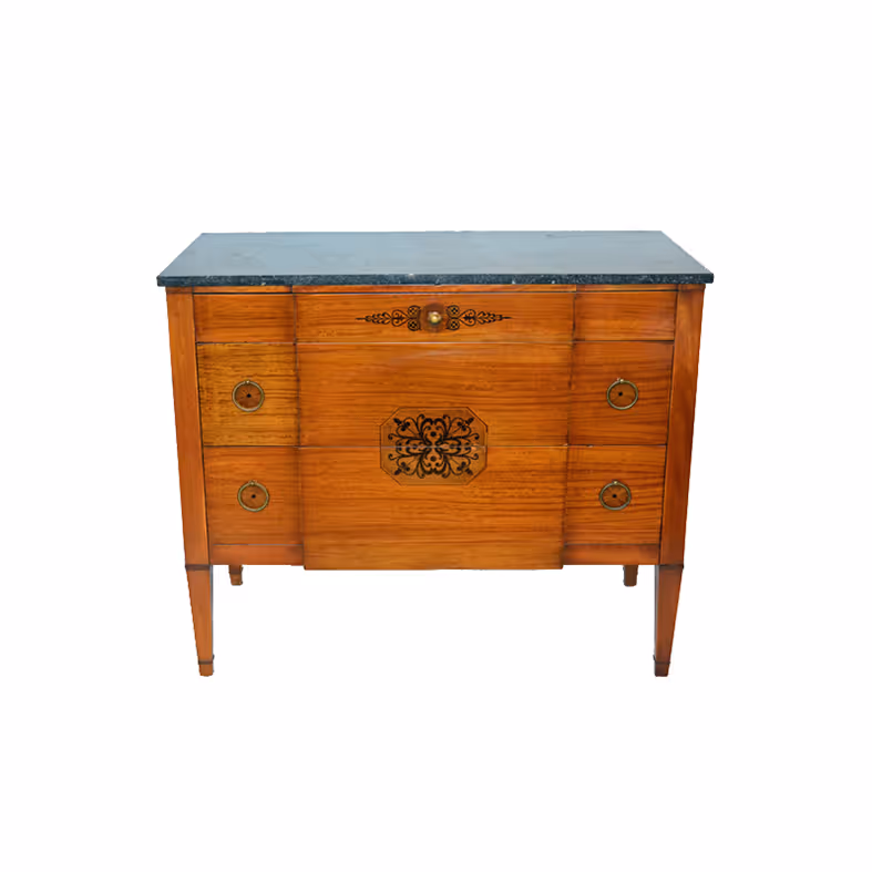 A light mahogany veneered commode of Directoire inspiration, with Charles X style ebony marquetry inserts. Two deep drawers and one flat drawer; dark grey fossile marble top; original brass pulls.