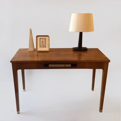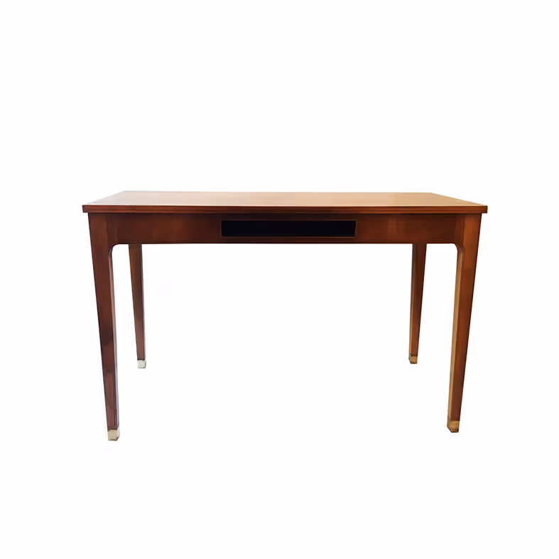 An elegant, bowed writing table with document slot, tapered legs and brass feet. Walnut veneers, cross-banded top.