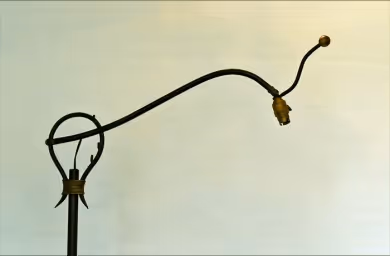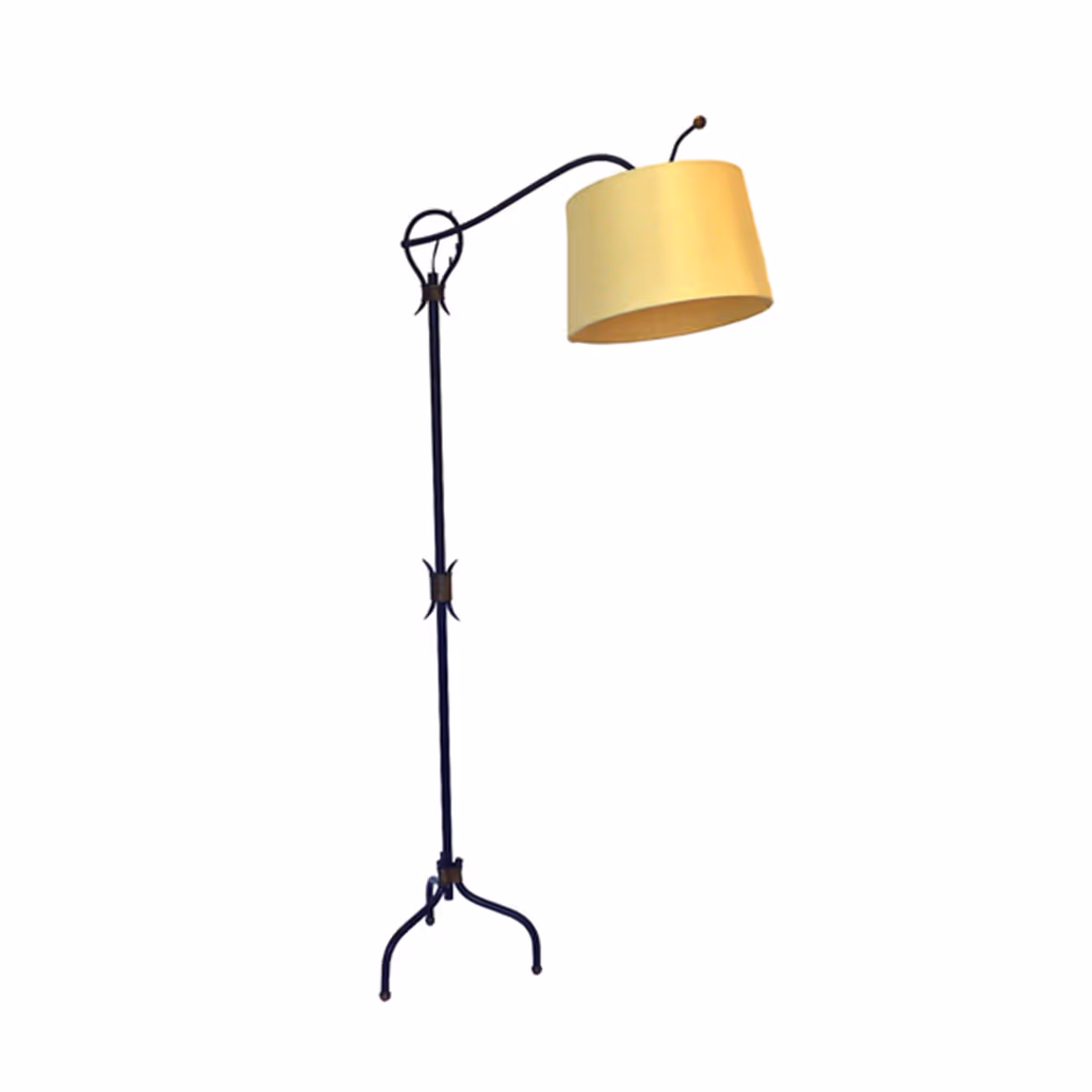 A wrought iron lampadaire crémaillère floor light in the style of Jean Royère. The arm adjusts thanks to the notches in the loop at the top of the shaft and the angle of the shade can be tilted thanks to the handle. A very good quality lamp with interesting brass details. Rewired & PAT-certified; new silk shade