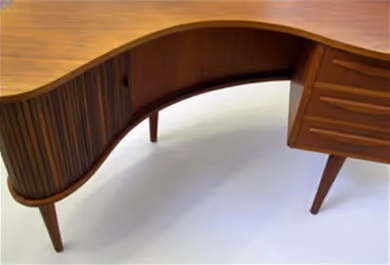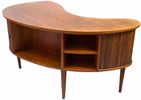 A kidney-shaped desk with 3 drawers and storage behind sliding doors