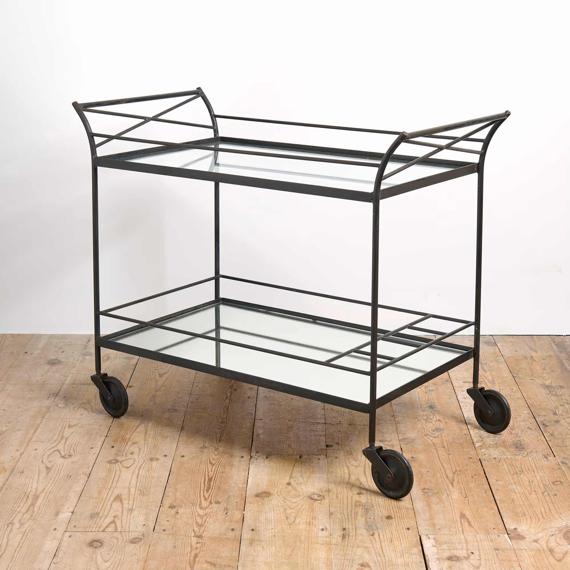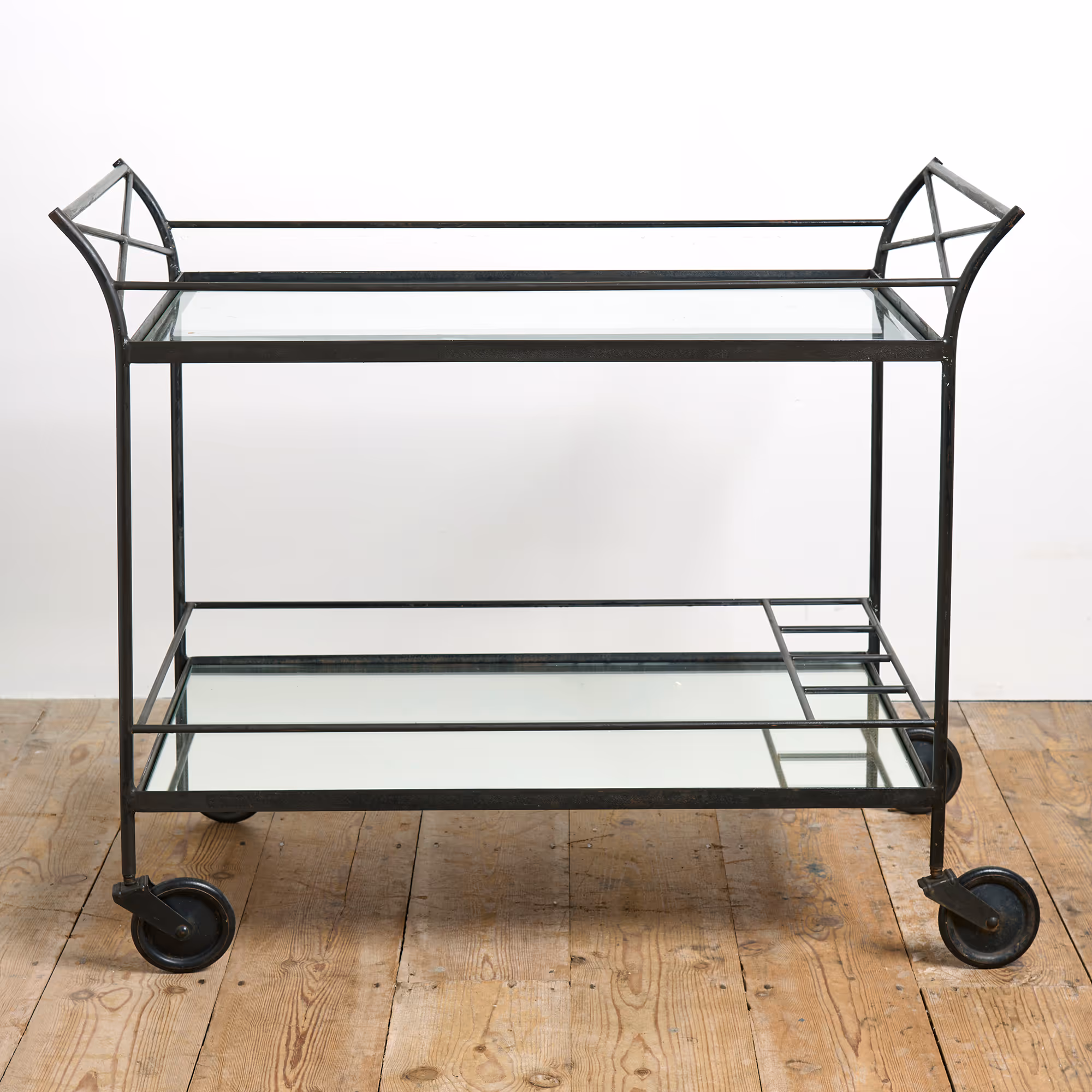 Elegant drinks trolley. Black steel frame, replacement clear glass & mirror tops.