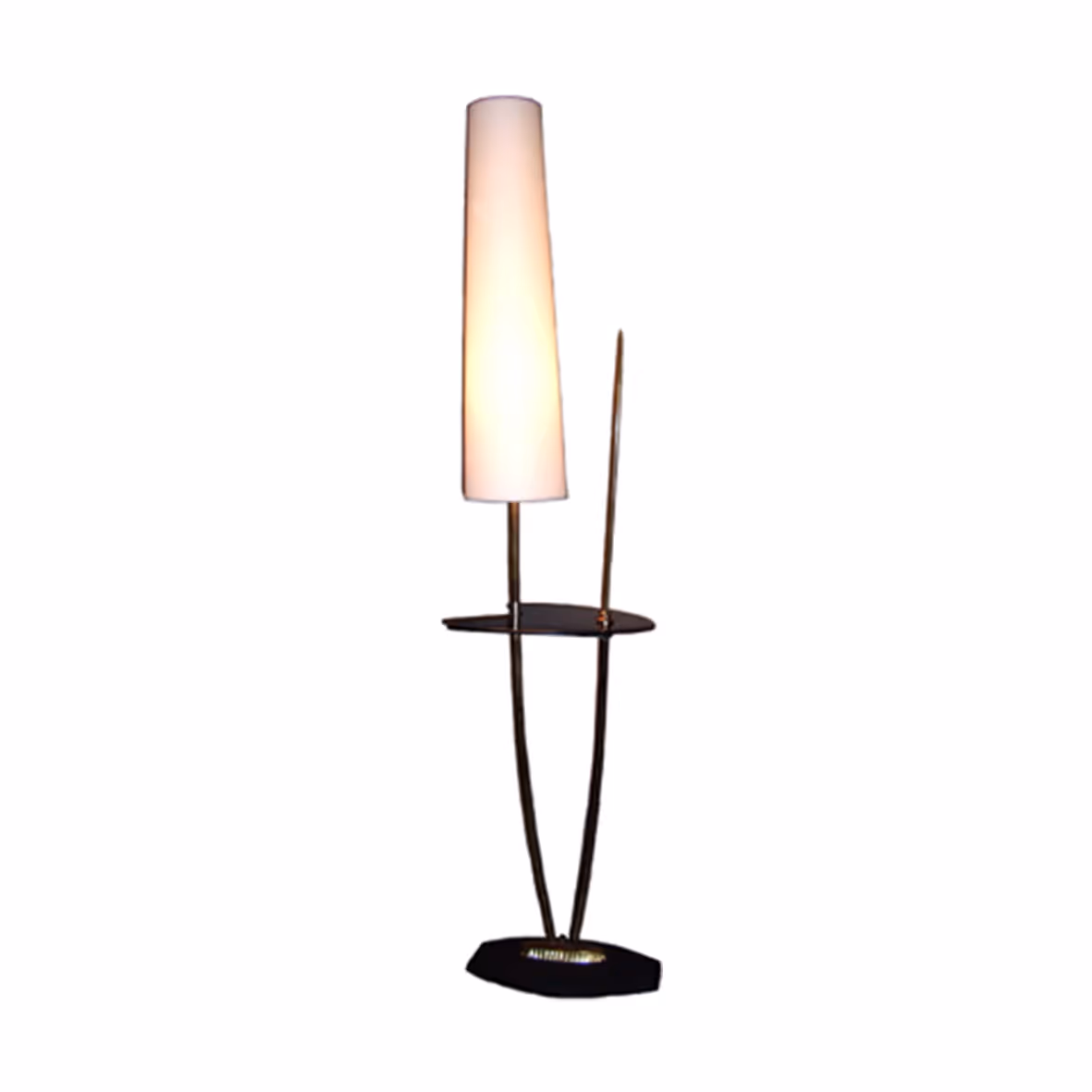 A floor light with brass stems and free form shelf in black glass. Newly custom-made lampshade in white cotton of the same shape as the original paper one. Newly rewired and PAT-tested