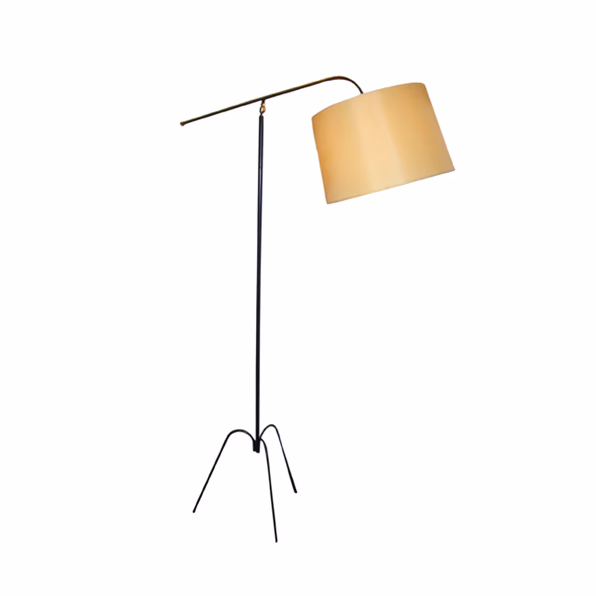 A black metal floor light with extending arm, Rewired and PAT-certified, new silk lampshade