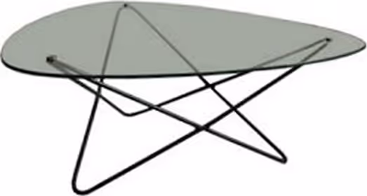 A coffee table with triangle-shaped glass top and elegant eliptical base in black powder-coated metal