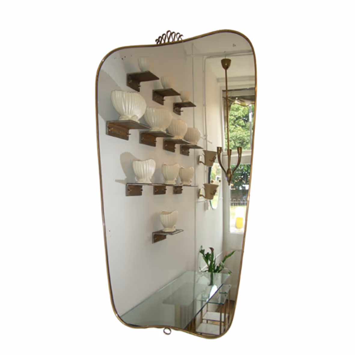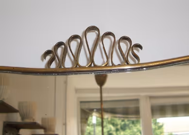 A brass mirror with scroll flourish at the top and ornament at the bottom, in the style of Gio Ponti