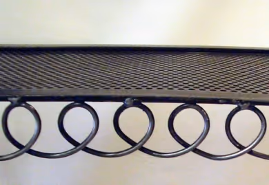 A metal console table in the style of Mathieu Matégot with beautiful scroll detail and perforated top. Recently sanded down to raw metal and lacquered with clear varnish. Can be used indoors or outdoors.