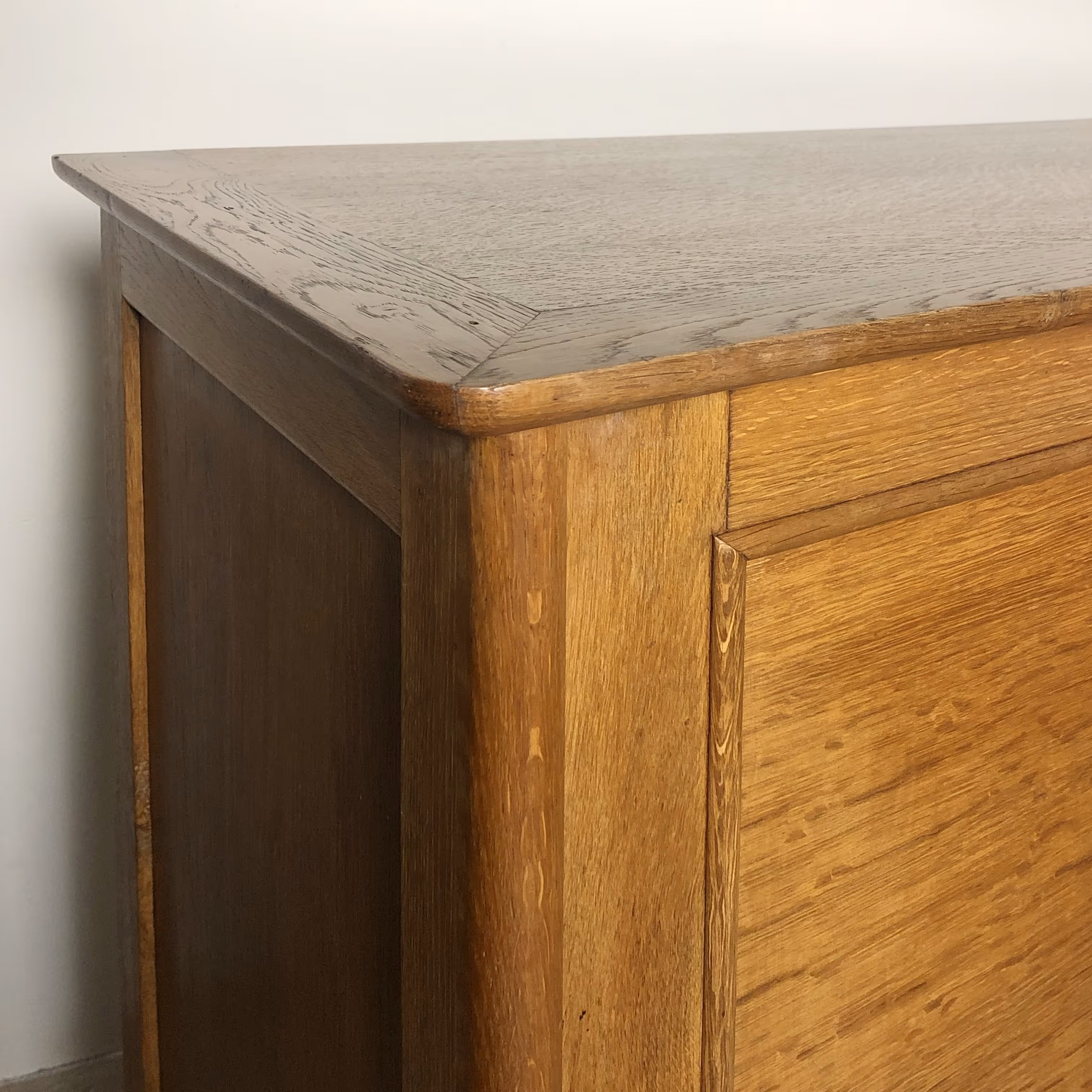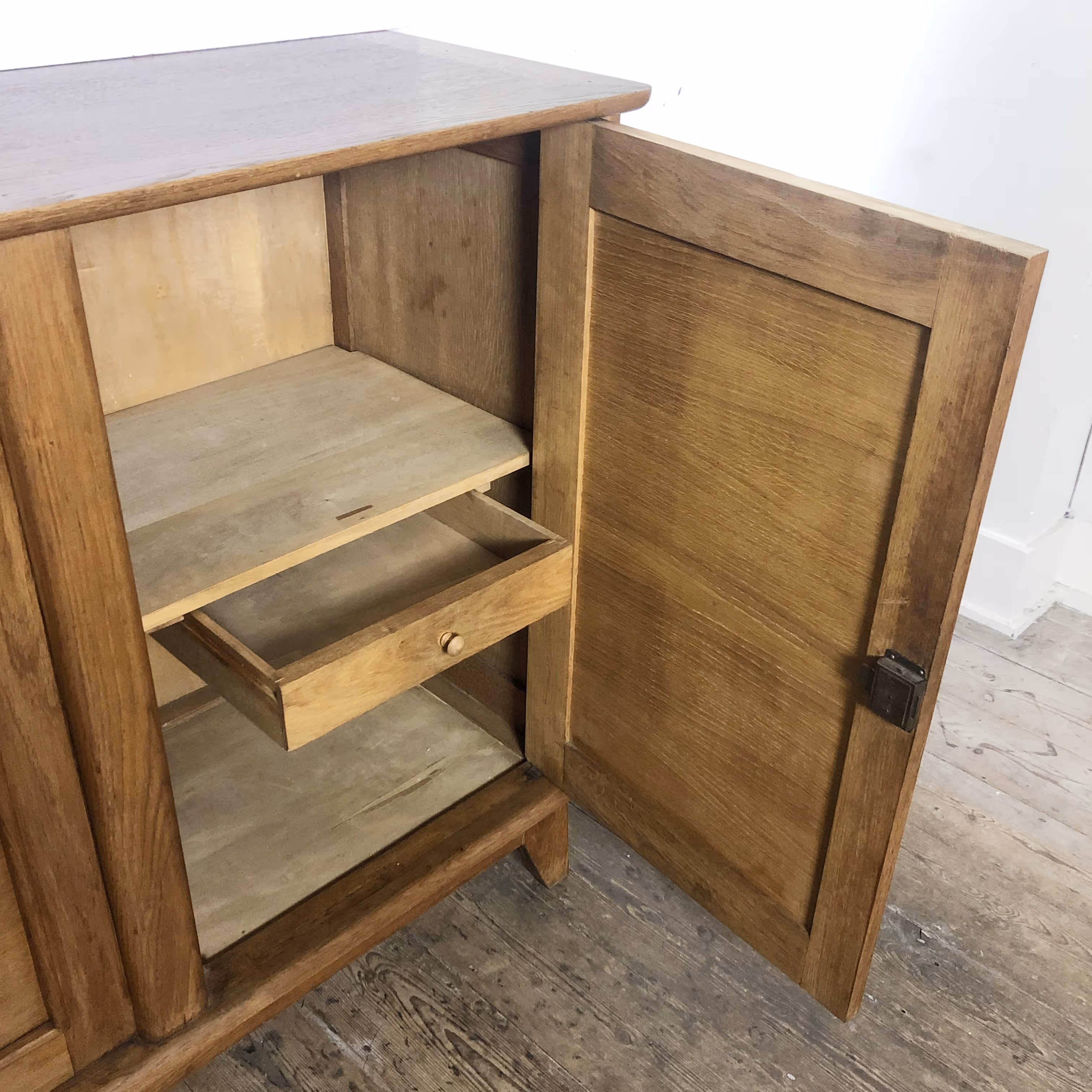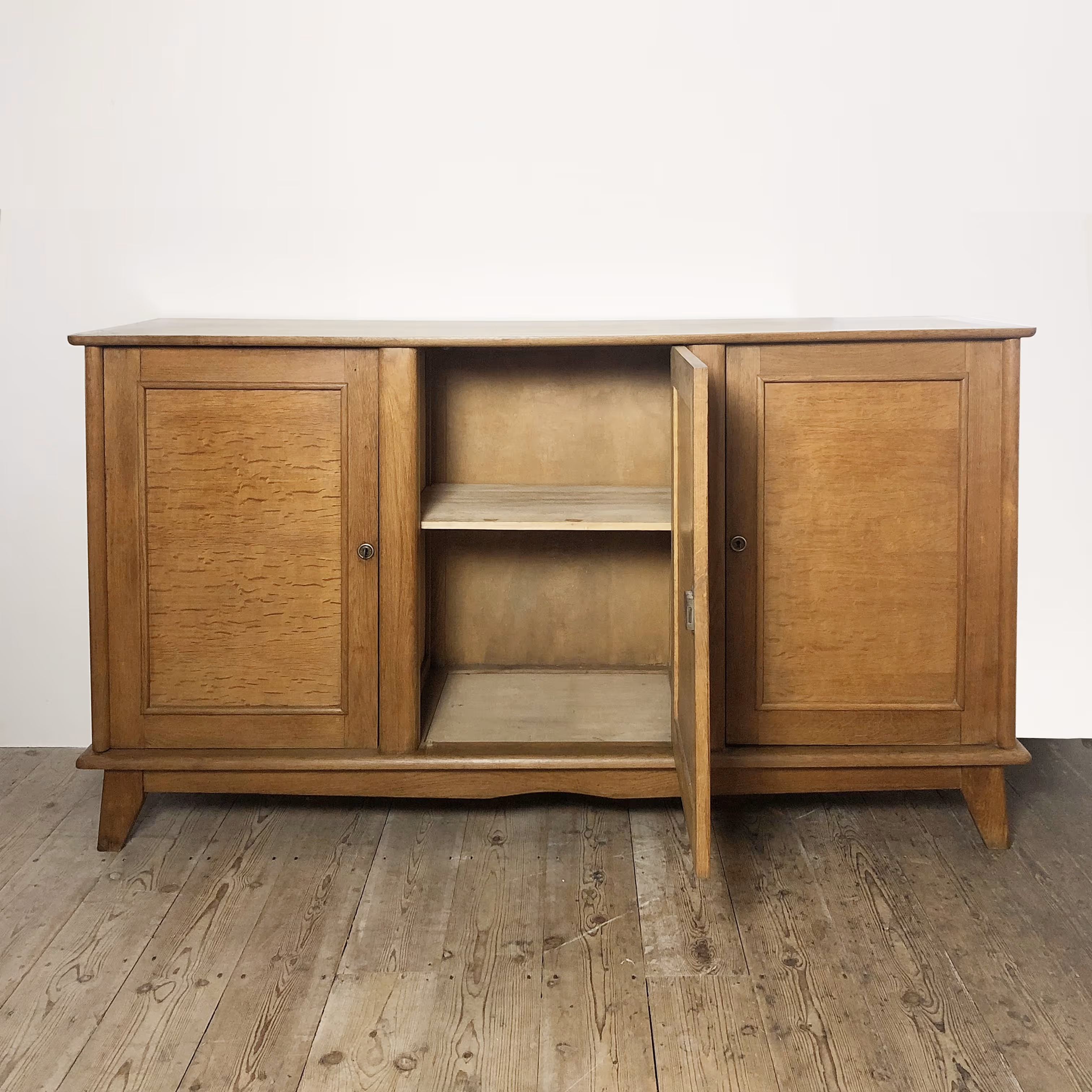 A large solid and veneered oak sideboard from the Reconstruction period, just after WW2. It comprises of three doors revealing one shelf each two drawers.