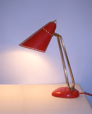 A brass desk light with adjustable, shade in red-lacquered perforated metal (original paint, very good condition)