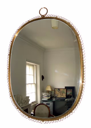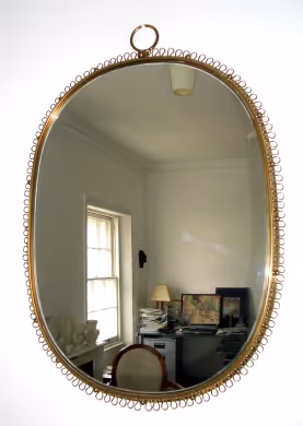 A 1950s mirror in a brass zigzag frame with an ornate flame-shaped hook Very good condition (new glass plate)