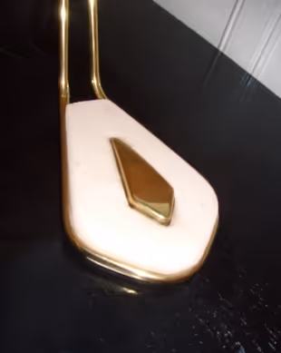 A desk lamp with large beige metal shade and brass accents. Unusual diamond-shaped switch on the base. Rewired & PAT-certified.