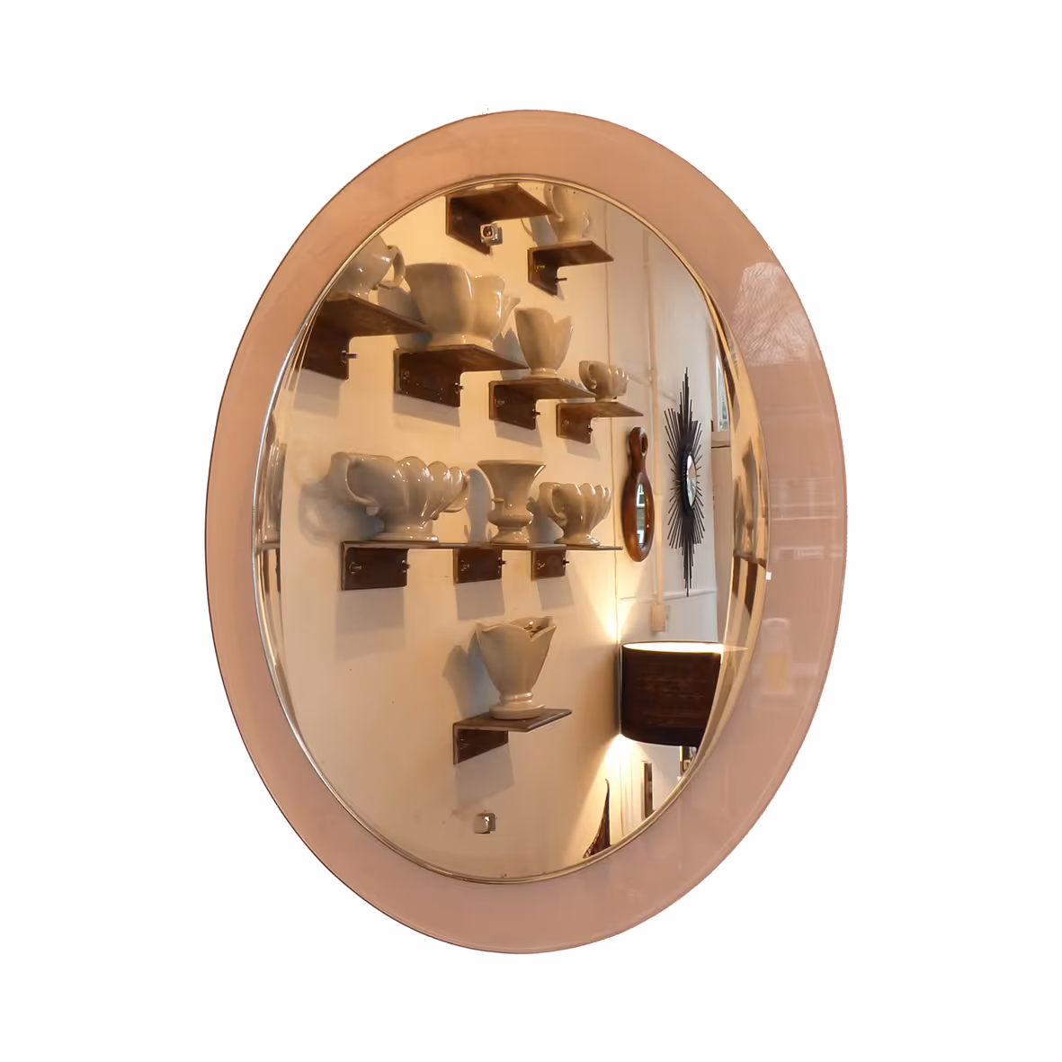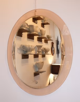 An oval mirror with peach glass surround and elegantly beveled plate (some foxing on the plate)