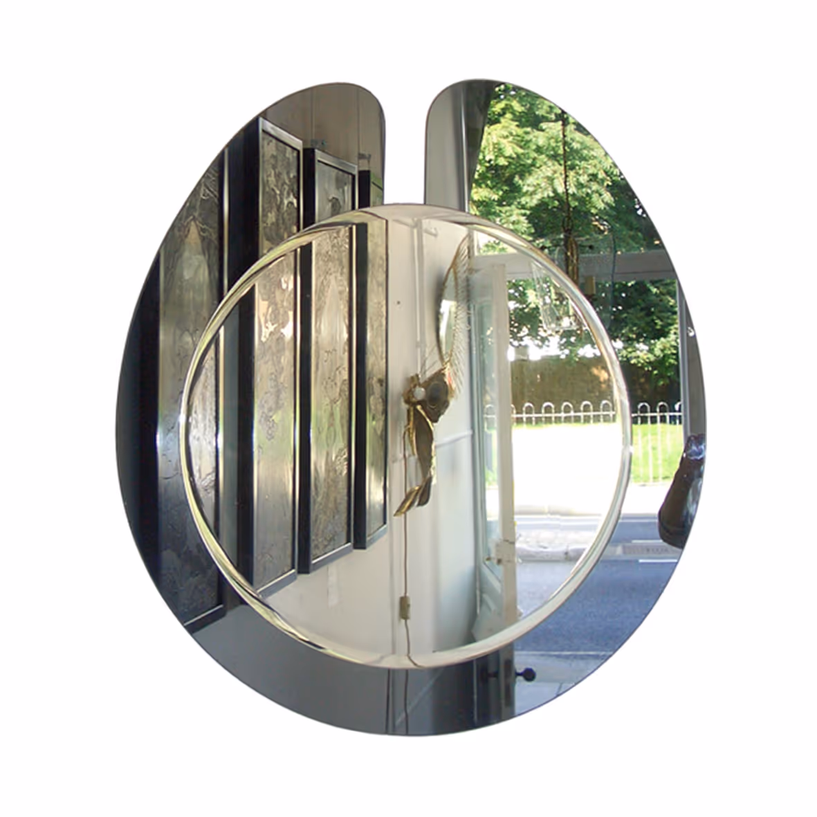 An unusually shaped mirror: round beveled plate and funky smokey mirror surround