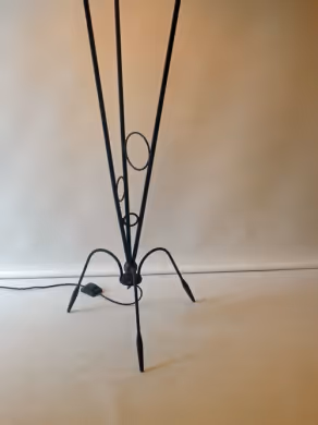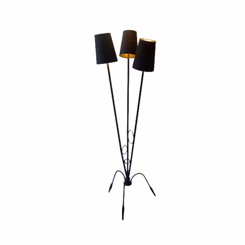 A black metal floor lamp with three arms of different heights, bespoke gold-lined black shade Rewired & PAT-certified