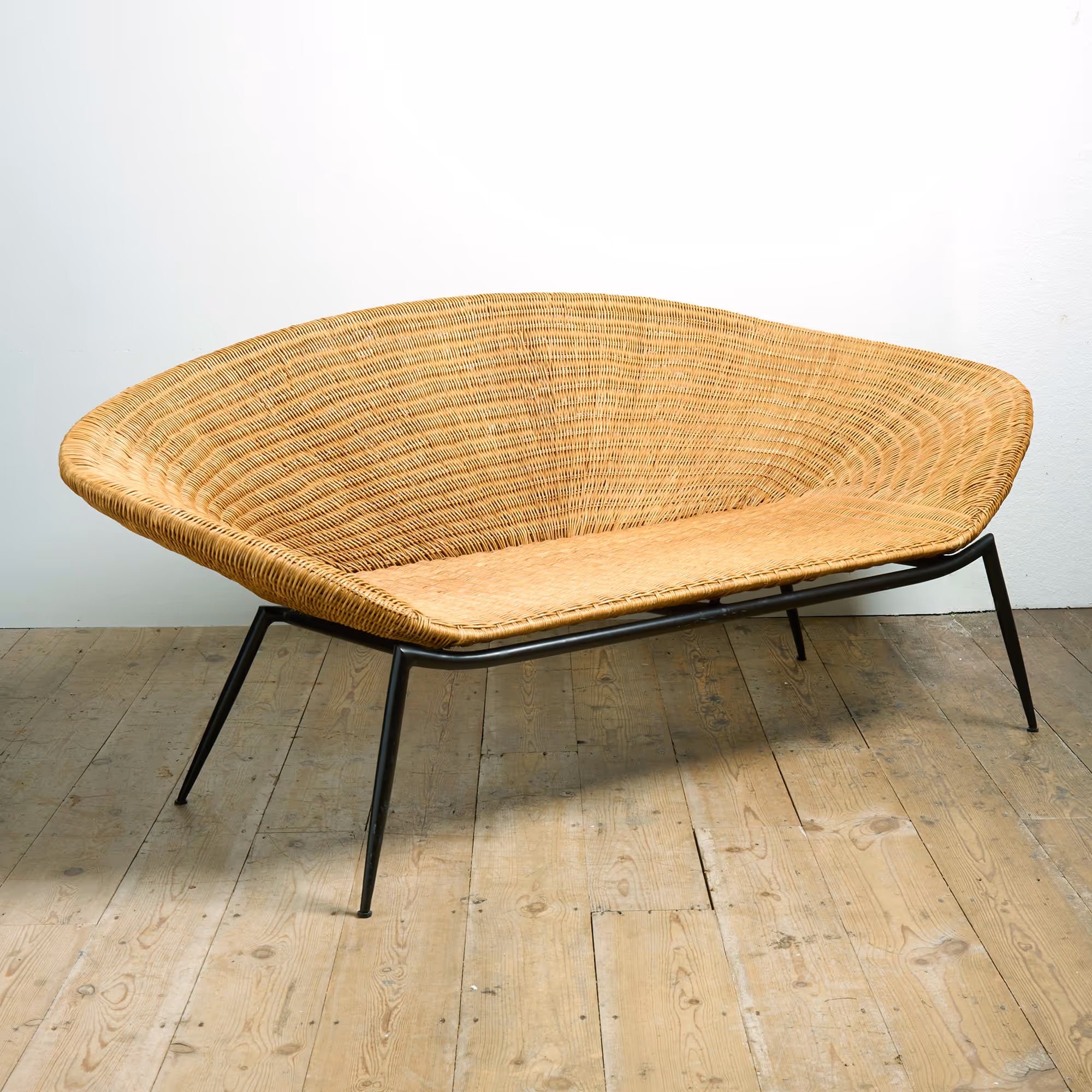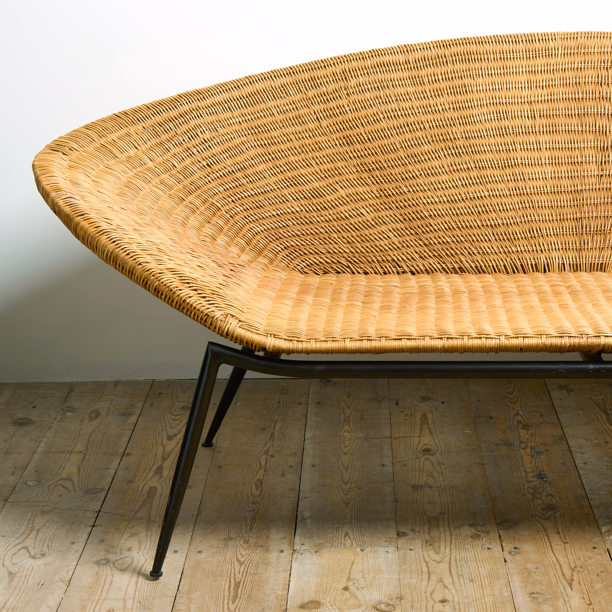 Sleek wicker sofa with black steel stand, designer unknown.Excellent condition.