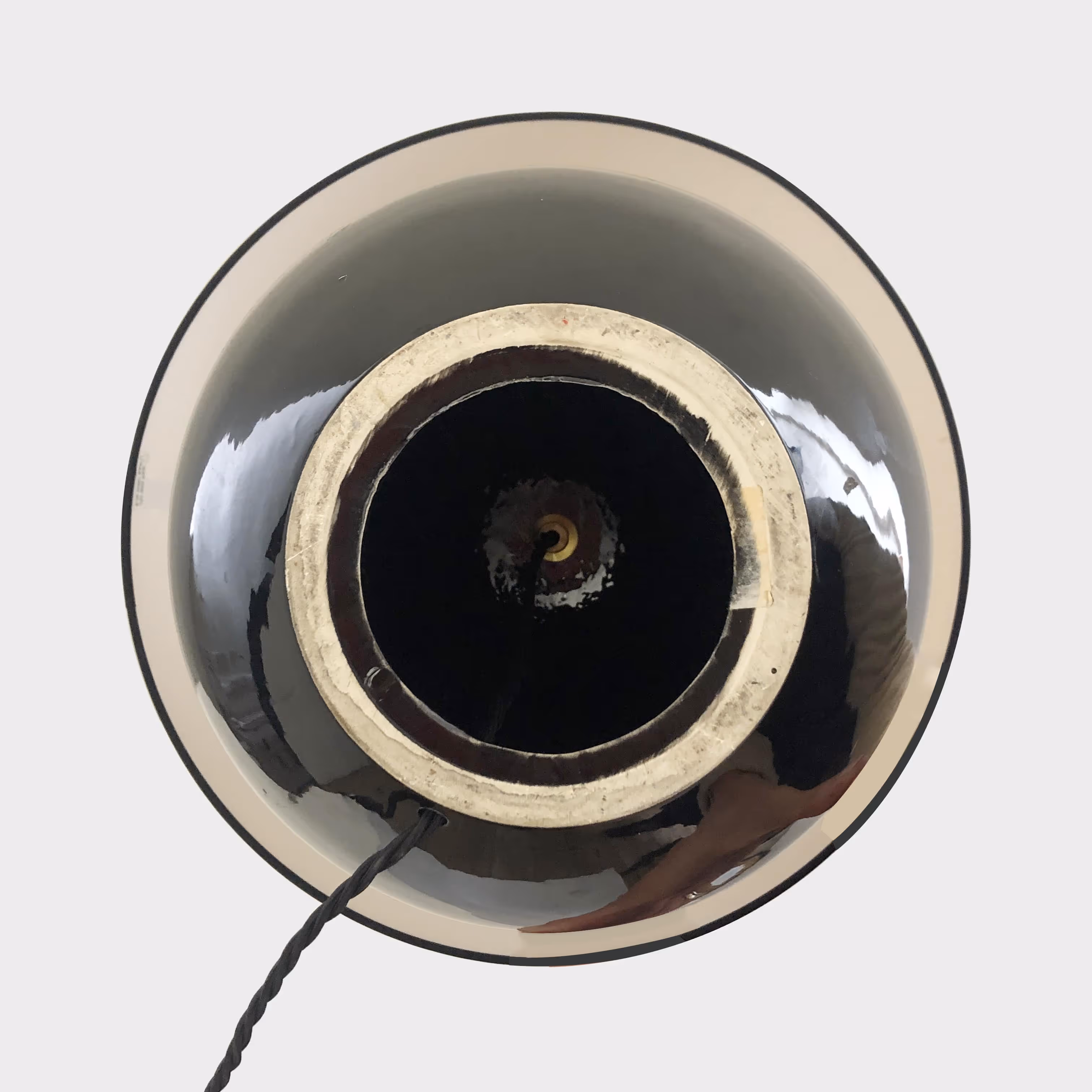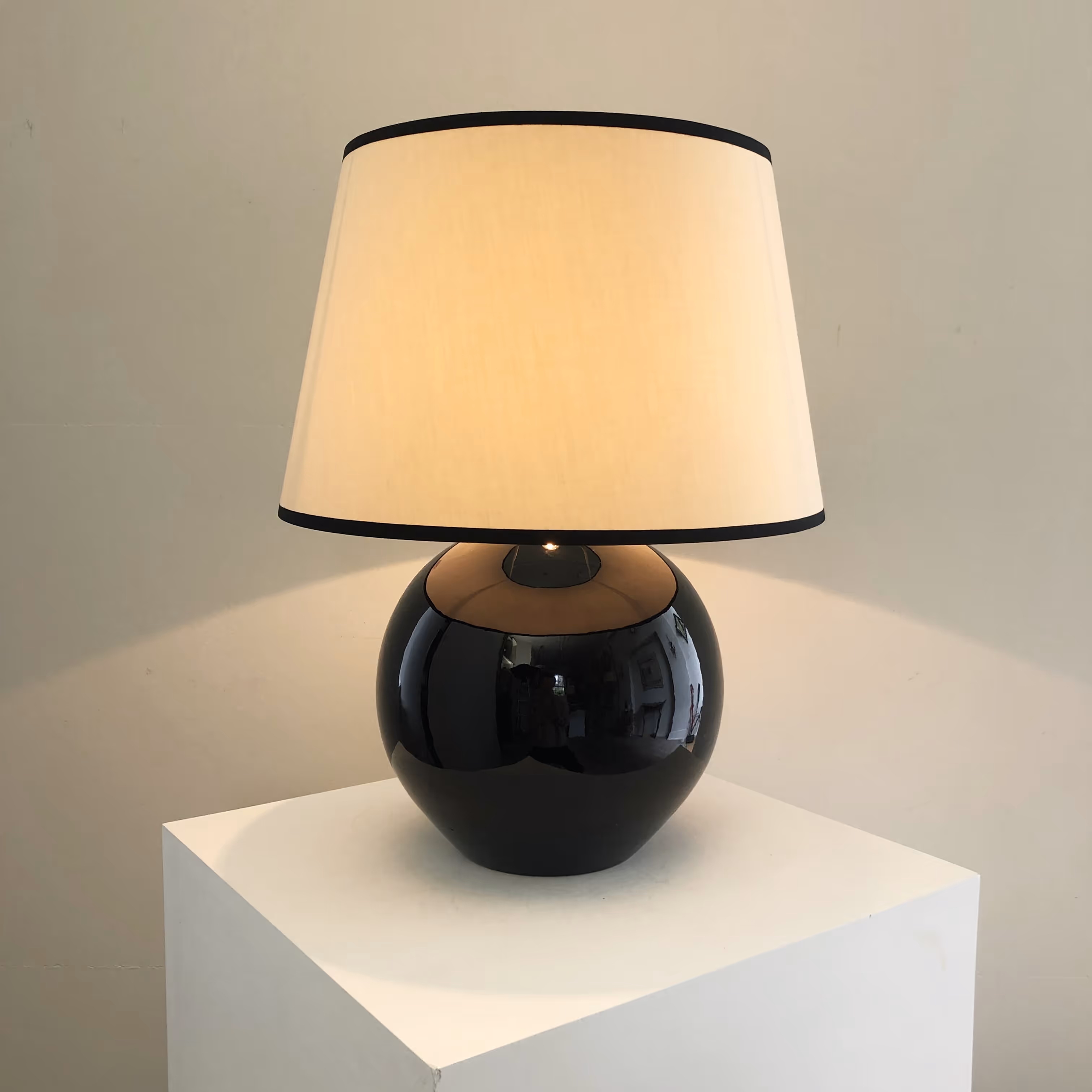 Rewired & PAT-certified, bespoke cream cotton shade with black tape.