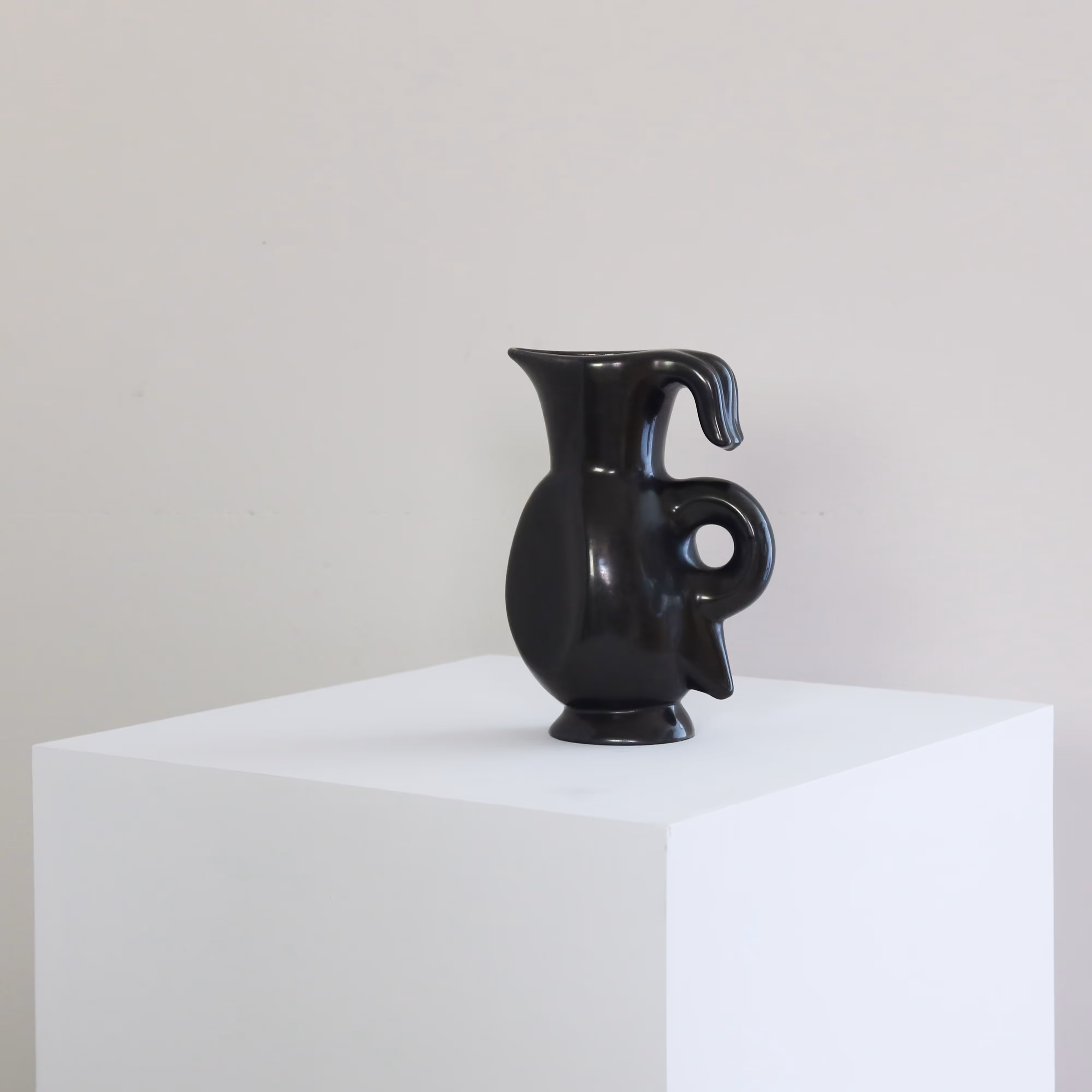 An unusual pottery jug in the shape of a stylised bird, matt black glaze.