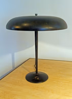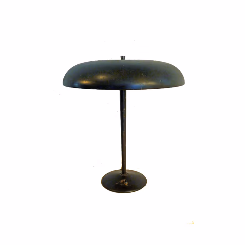 A circular black metal desk lamp with twin bulbs. Rewired and PAT-certified