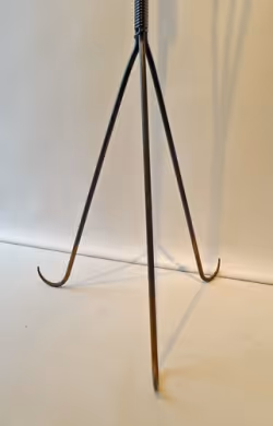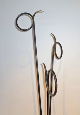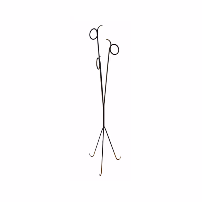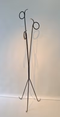A sculptural black metal hat stand with gilt detail on scrolls.