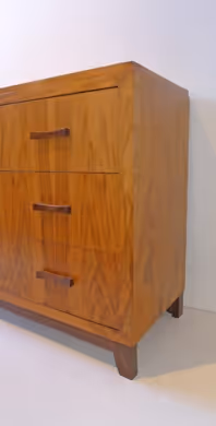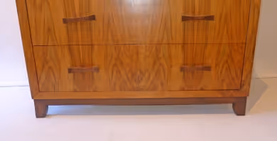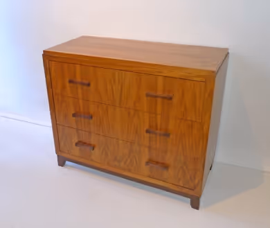 A small chest of drawers in veneered blond walnut, with contrasting base and pulls.
