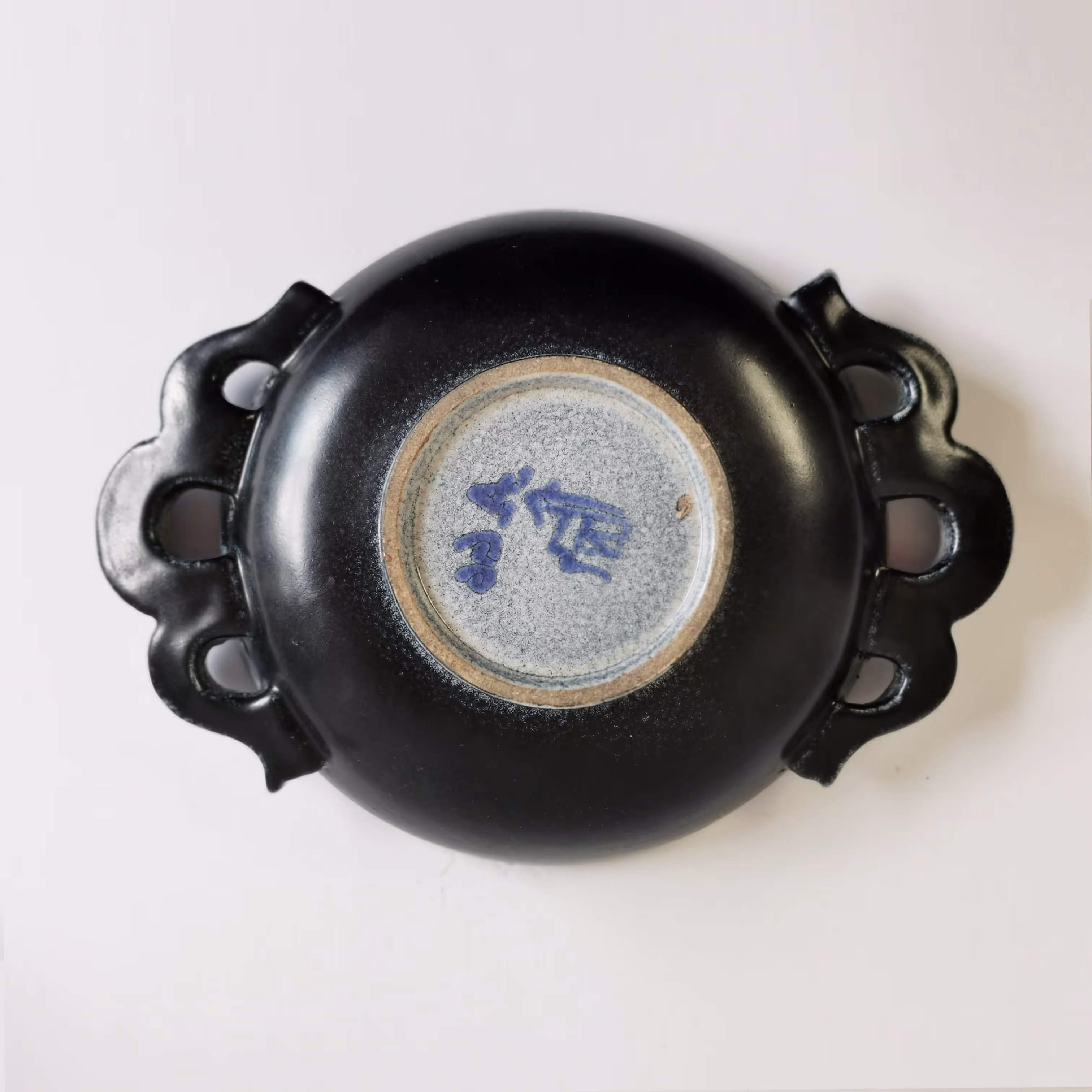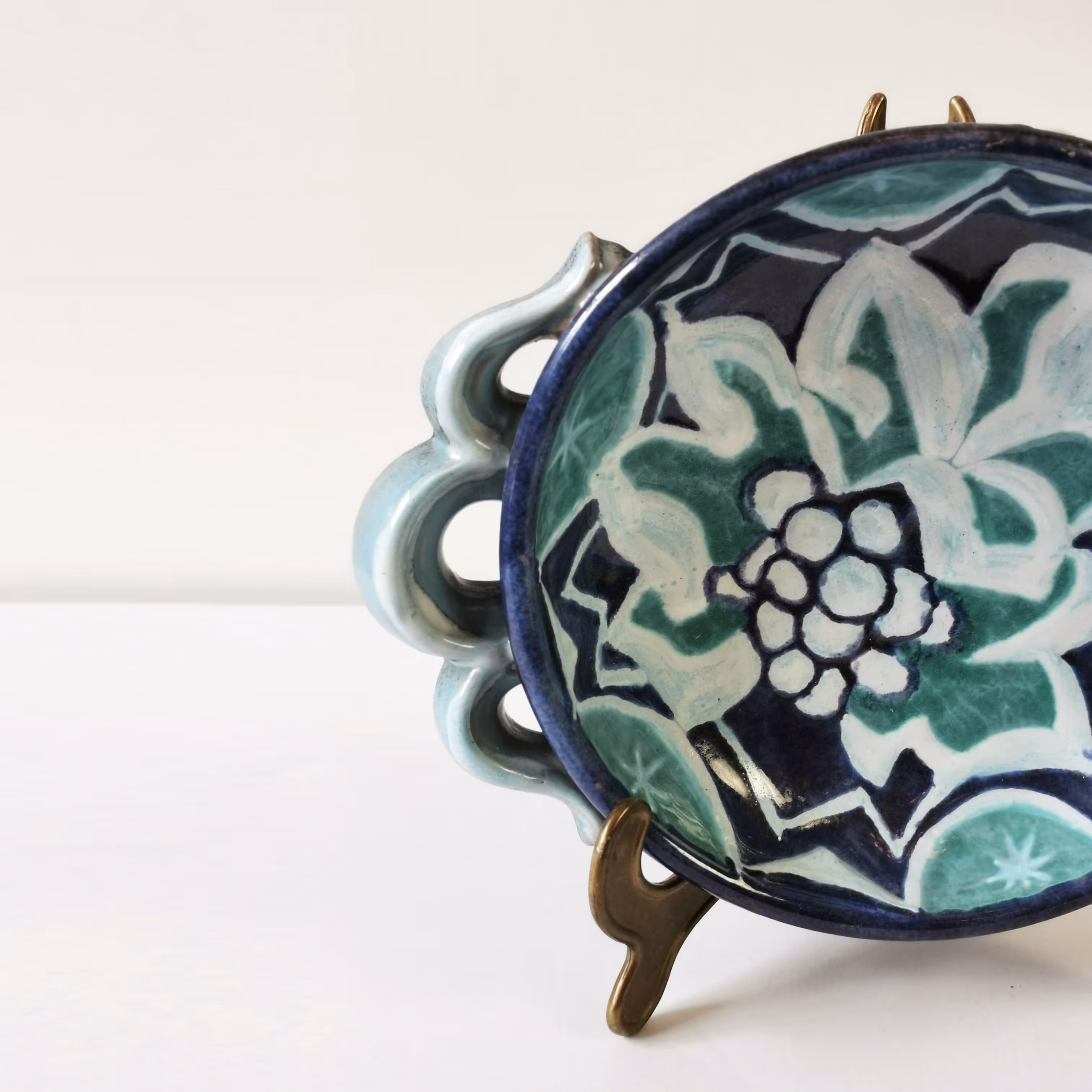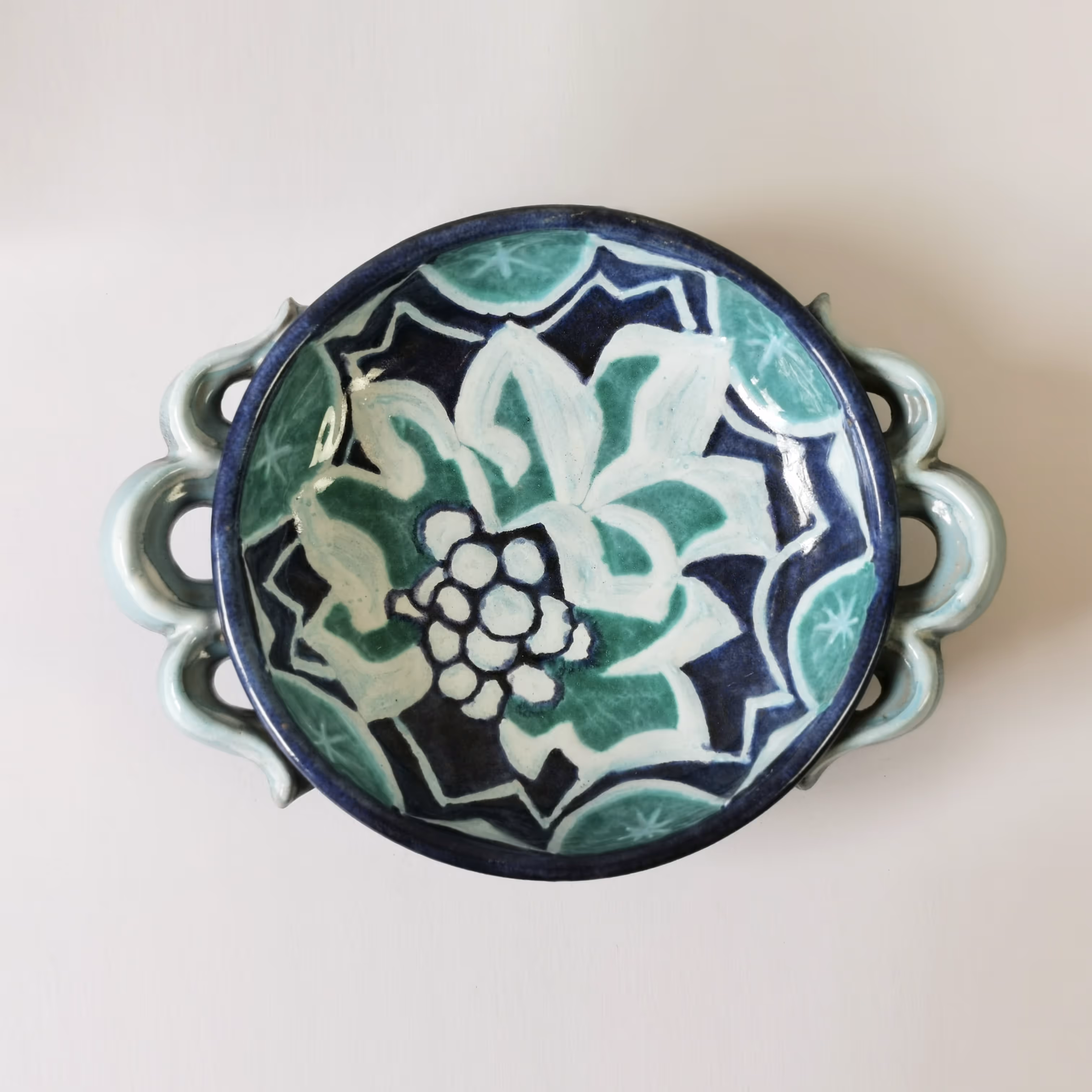 Pottery bowl with wavy handles. Blue & turquoise décor representing grapes on grey ground.