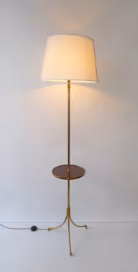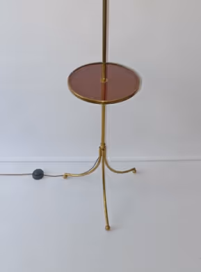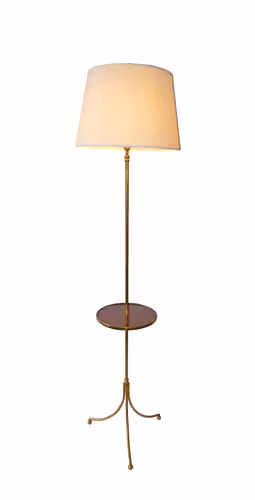 A brass floor lamp with circular wooden shelf. Rewired and PAT-certified