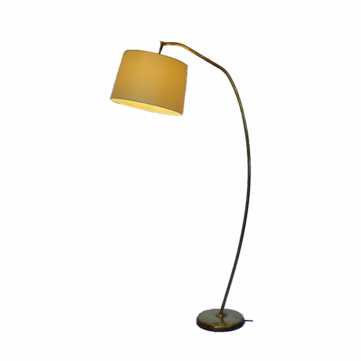 A brass arched floor lamp with an adjustable arm to change light angle Rewired & PAT-certified to UK Standards