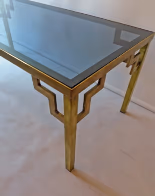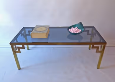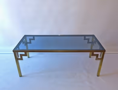 A brass coffee table by Romeo Rega, with glass top and oritental inspired detail.