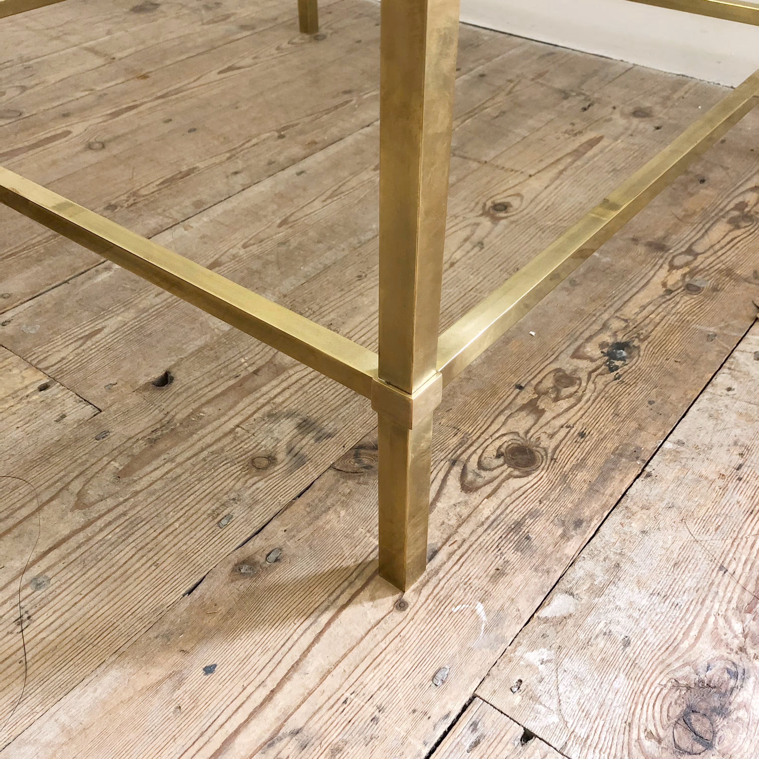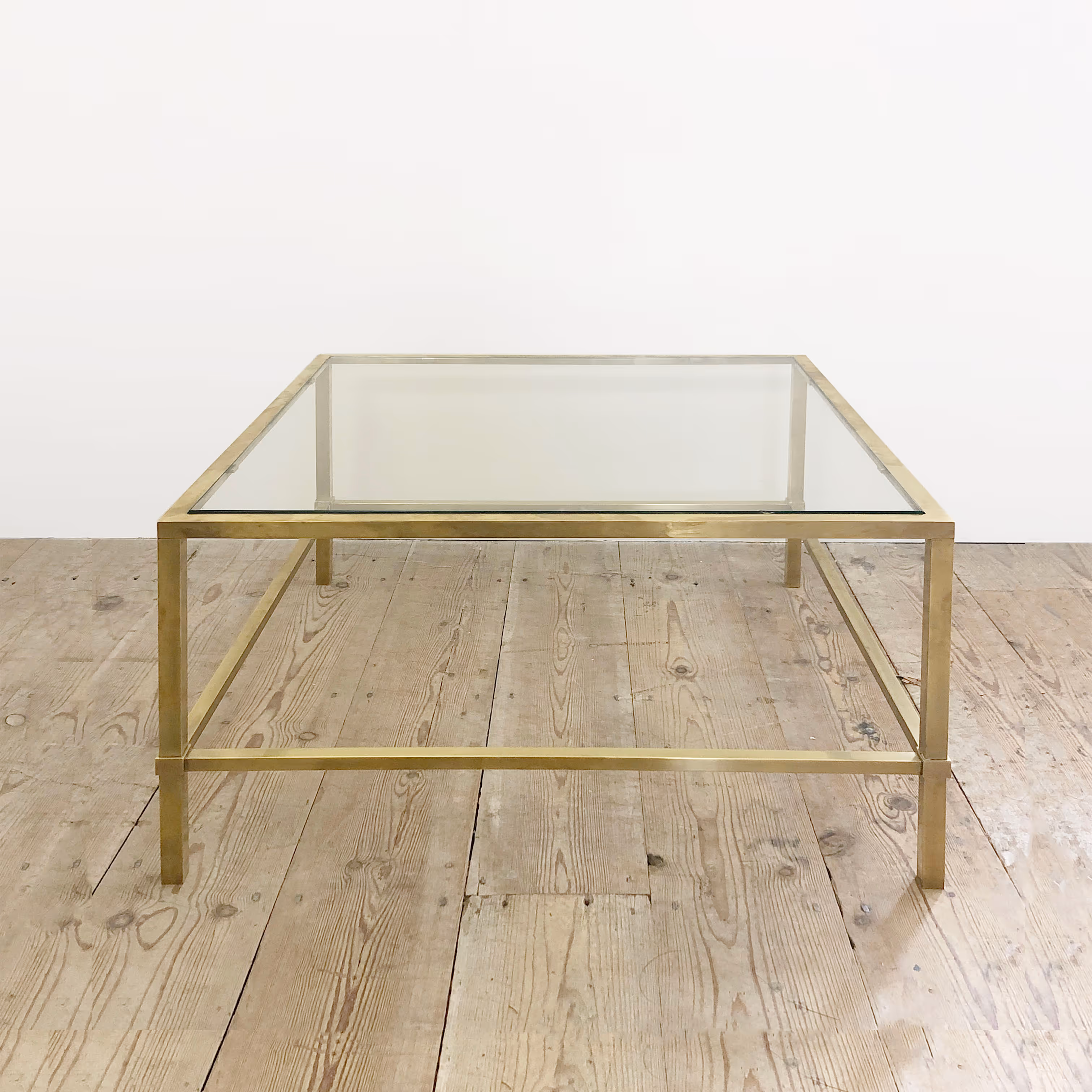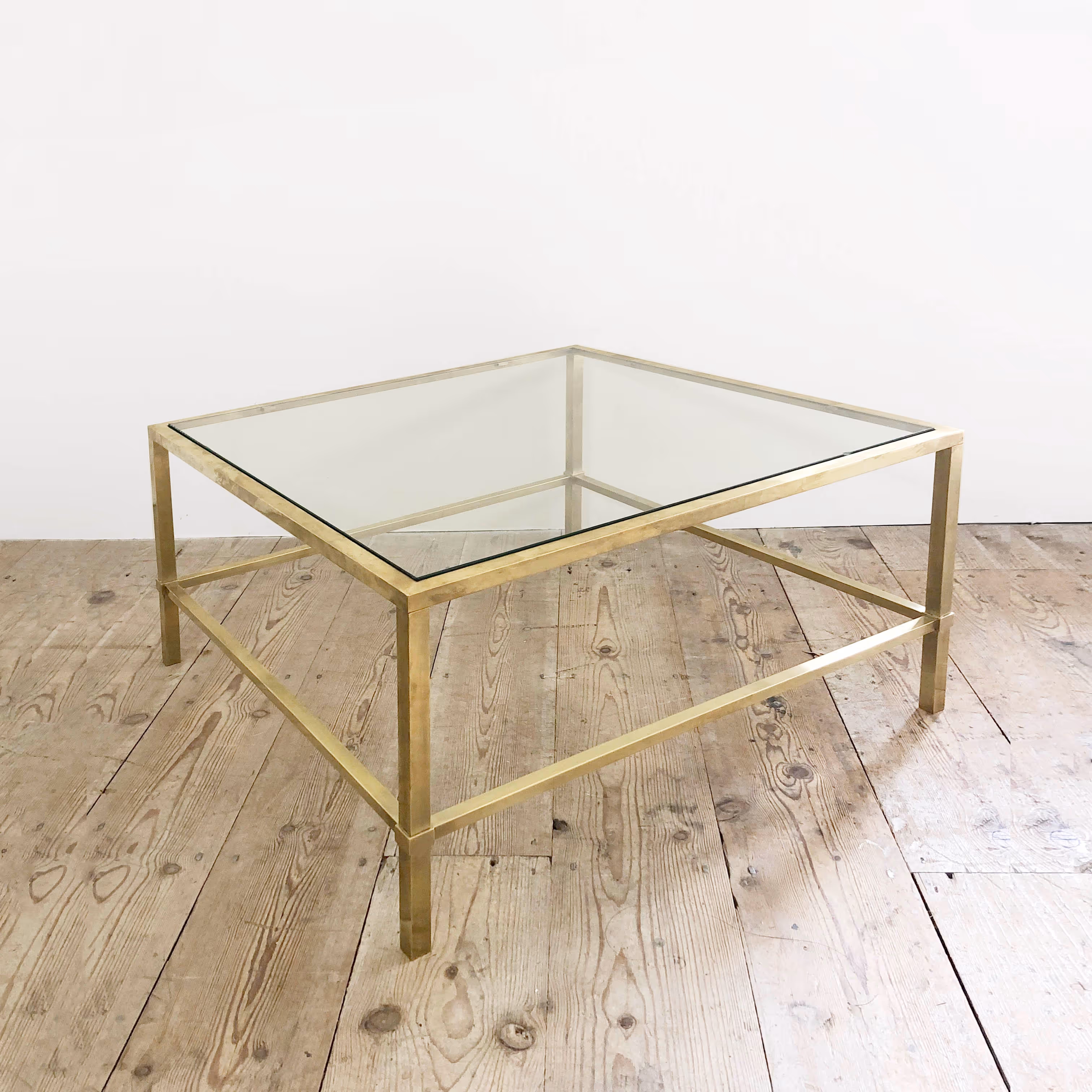 Square brass coffee table. Simple, elegant square sections, clear glass top.