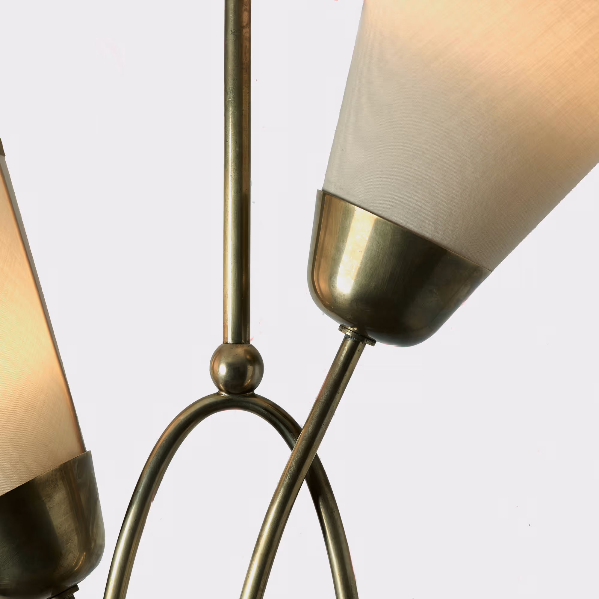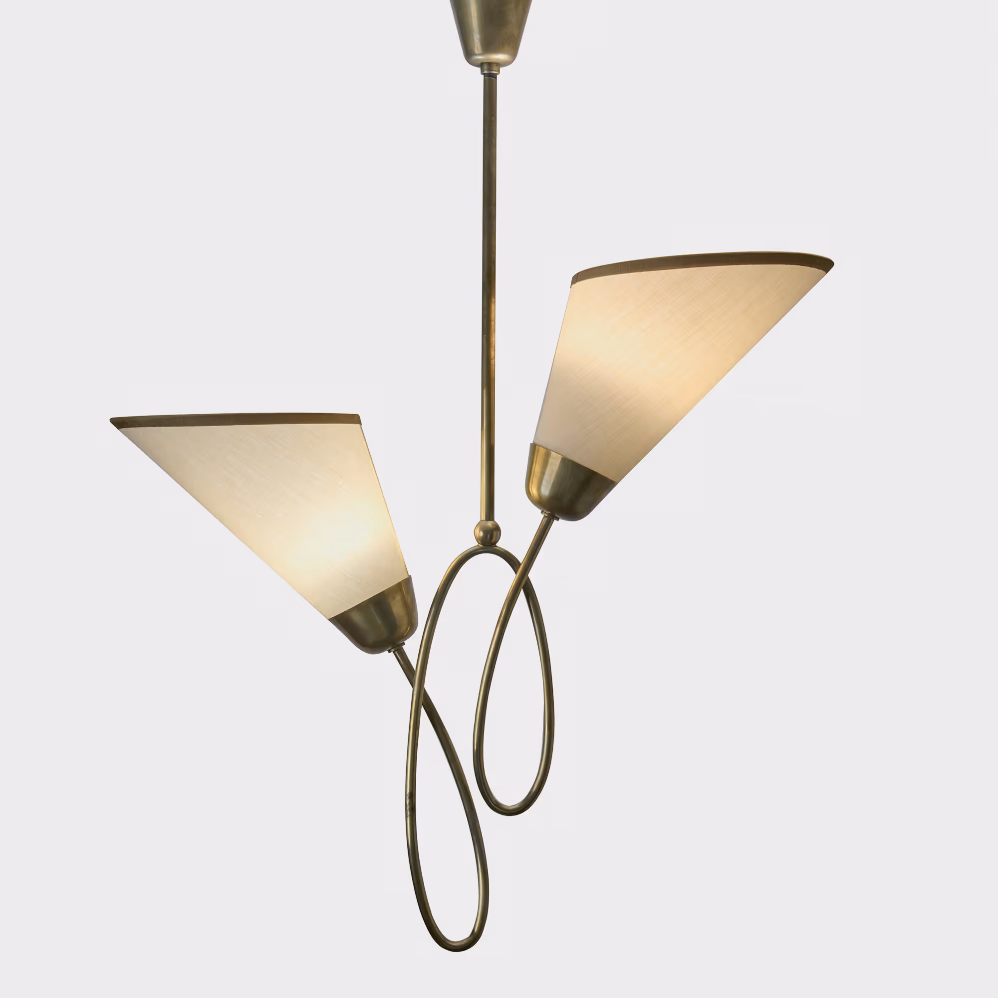 Two-way brass pendant light with loop detail. Original shades recovered in cream cotton with gold tape.