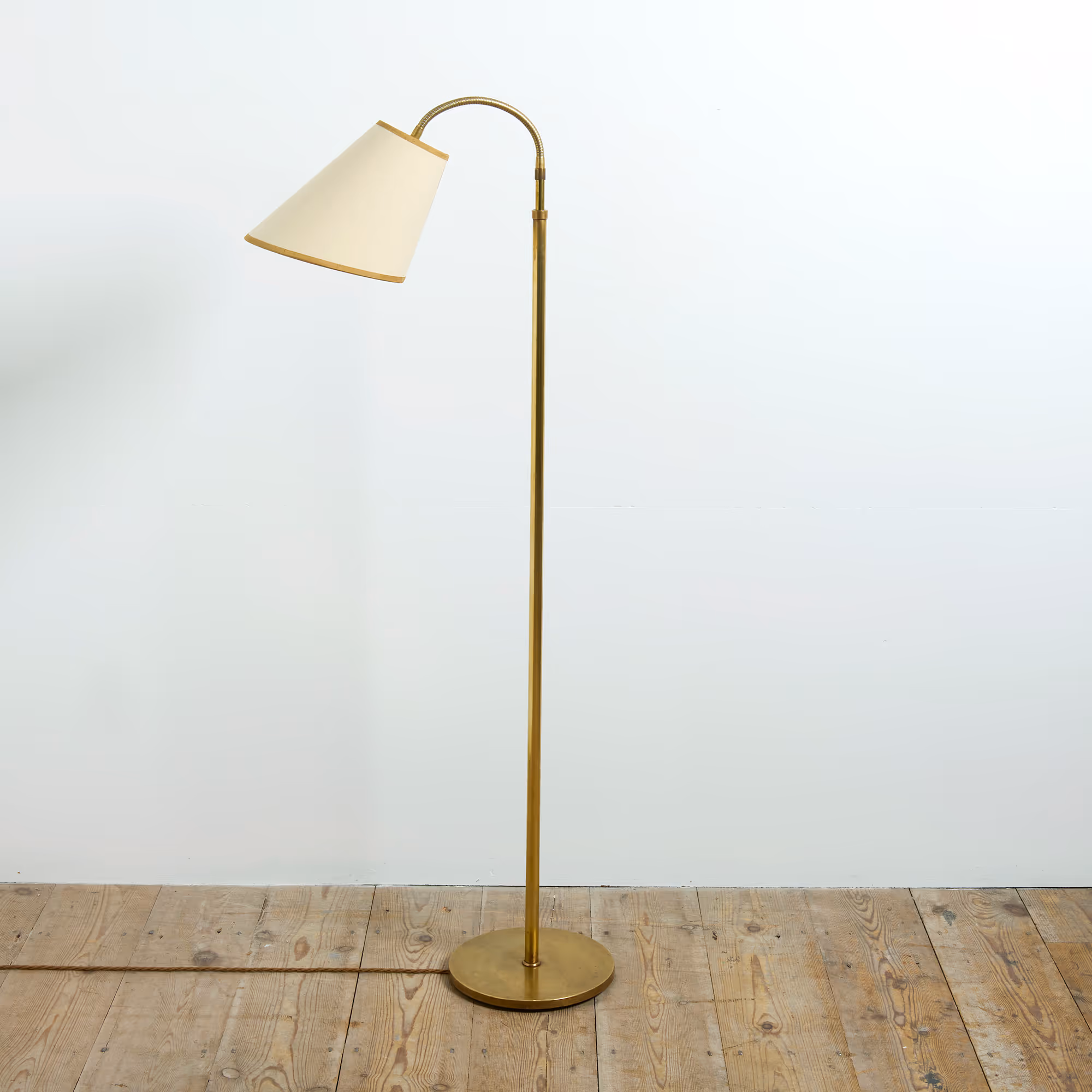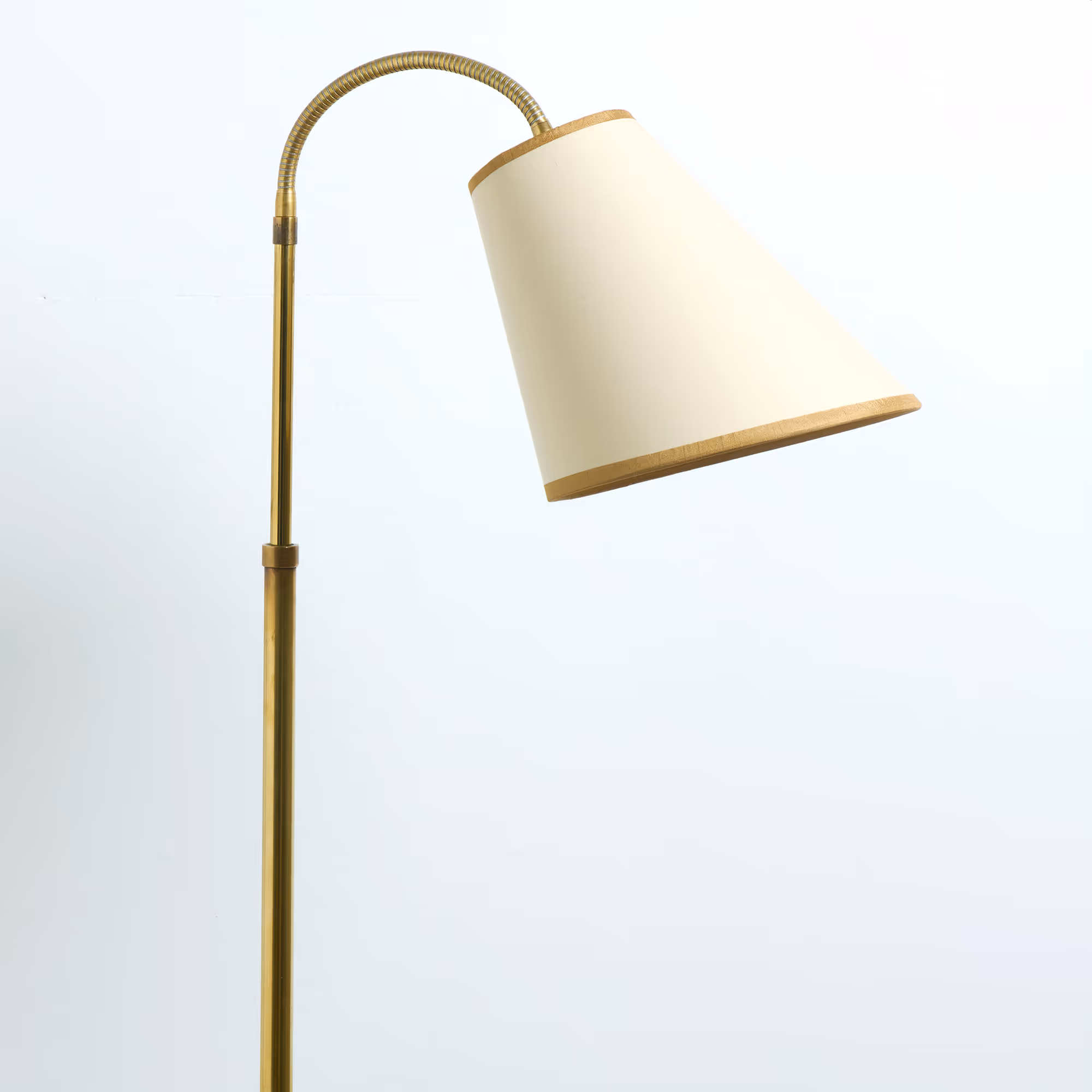 Brass reading floor lamp (adjustable height). Rewired & PAT-certified, bespoke shade.