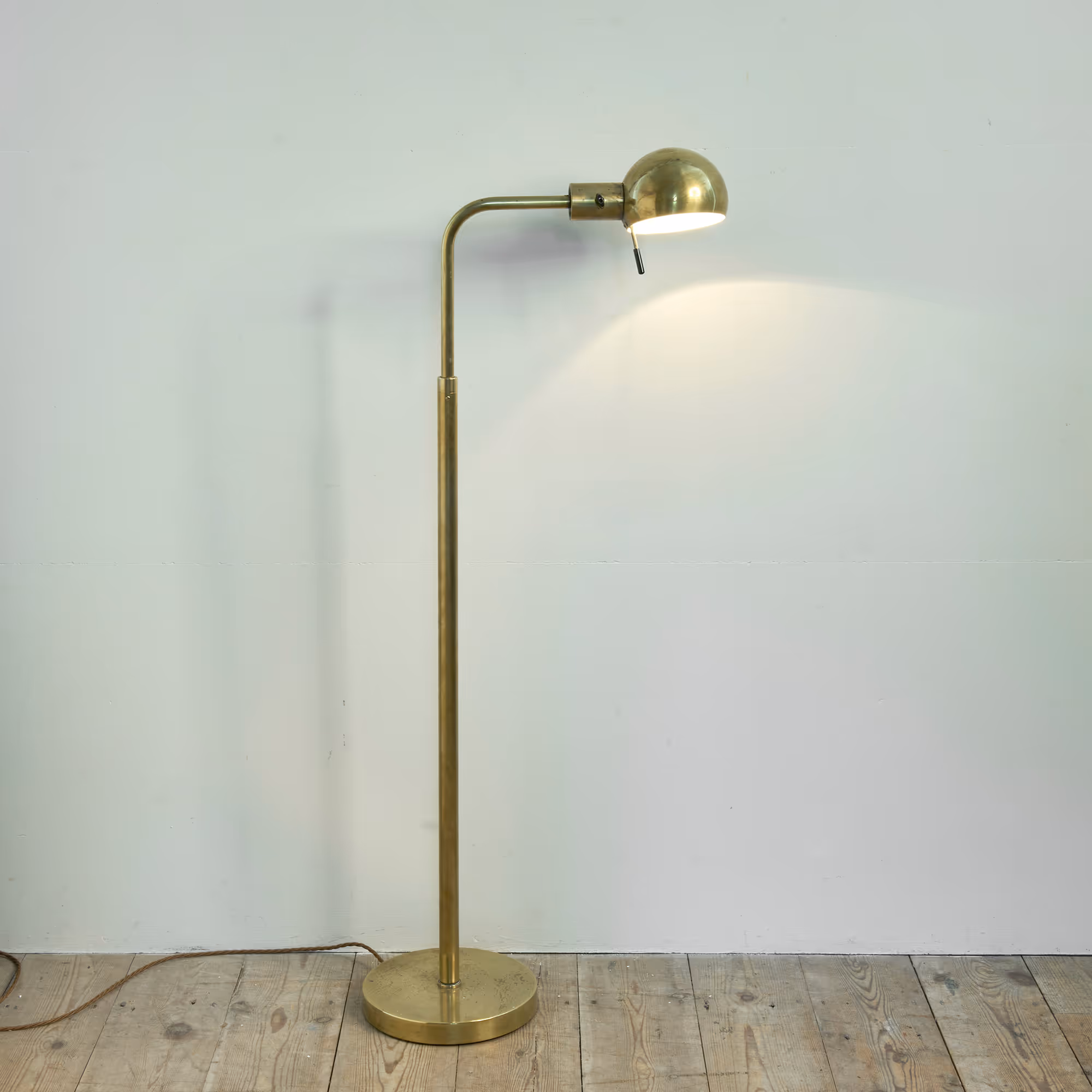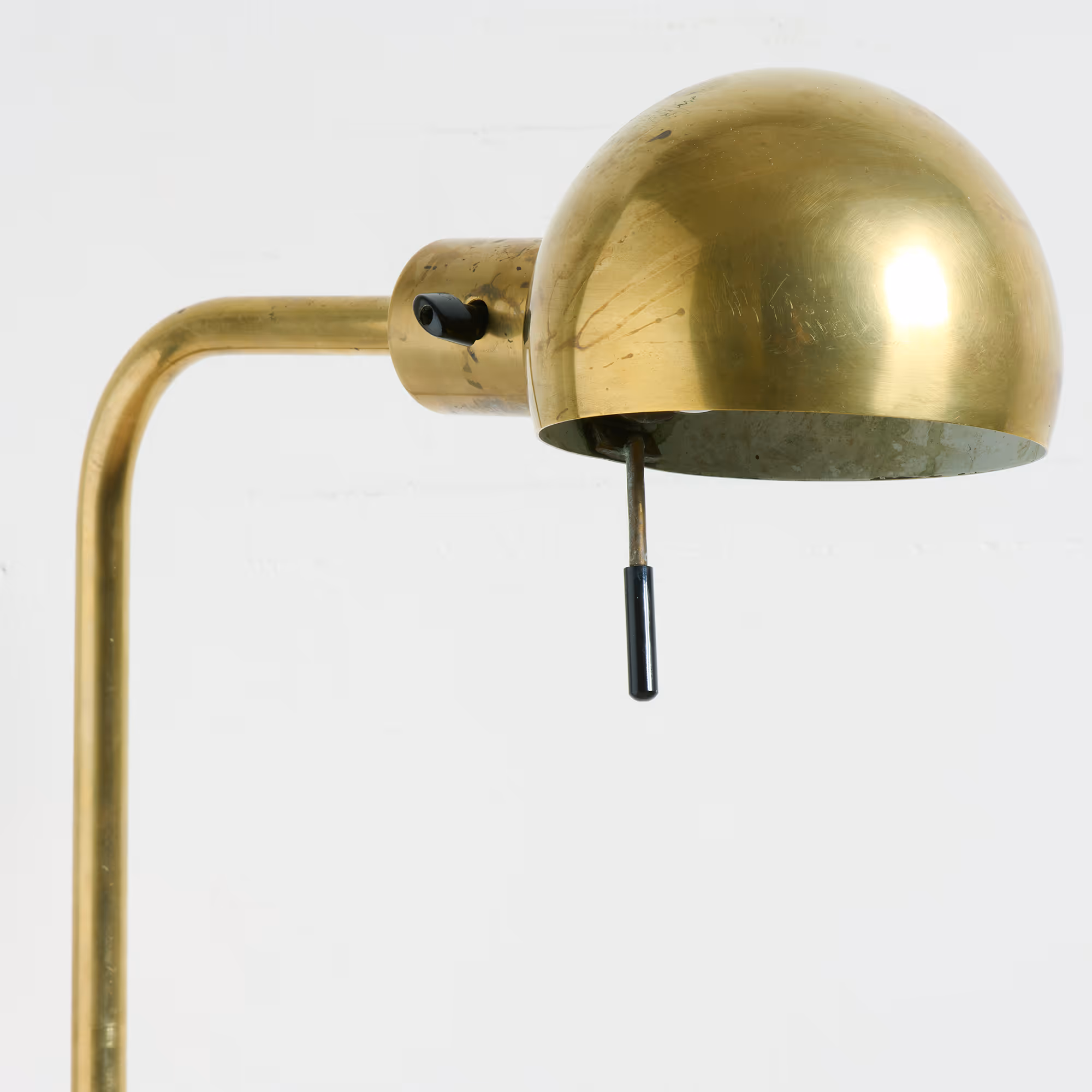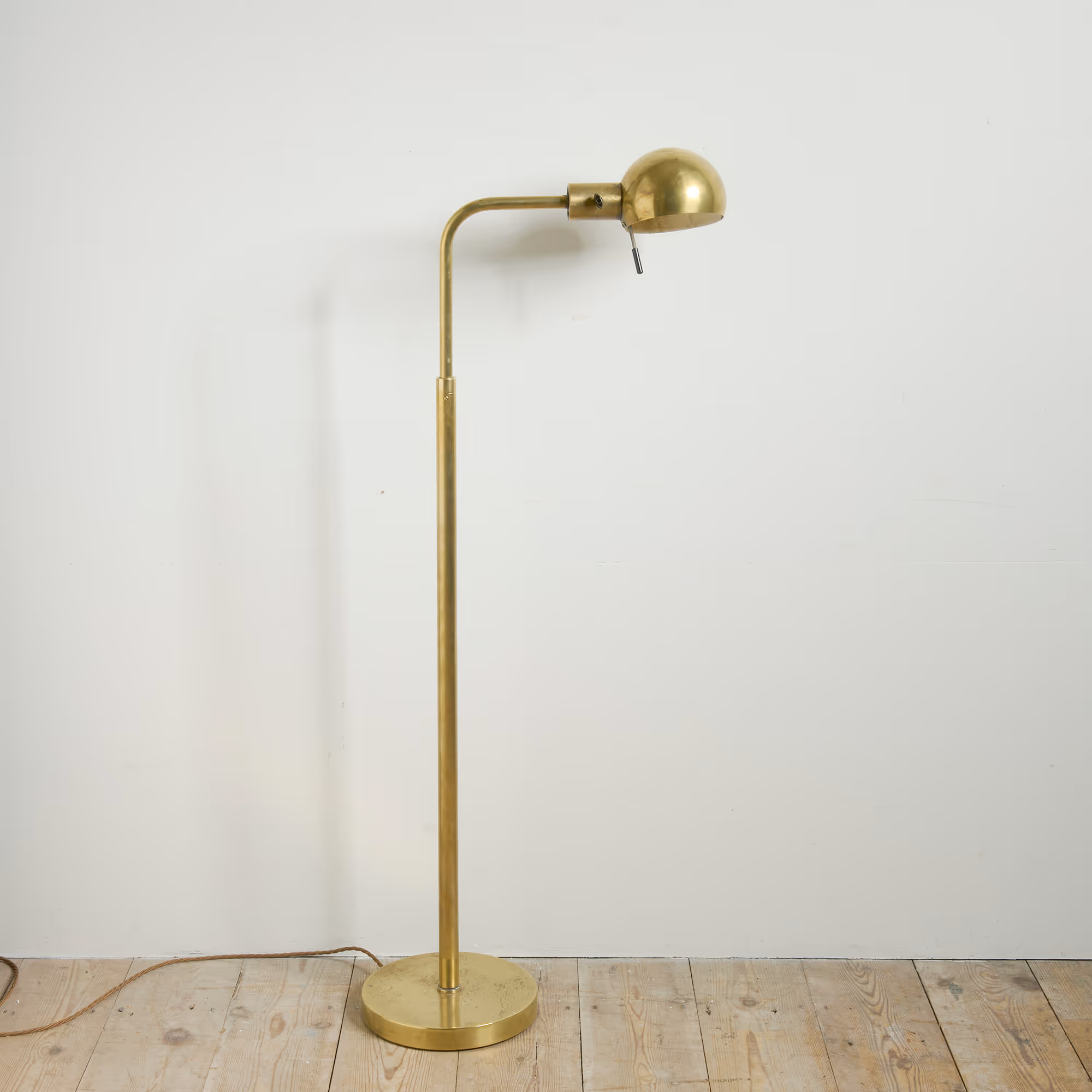 Brass reading floor lamp with round, directional shade and original twist switch. Adjustable height.