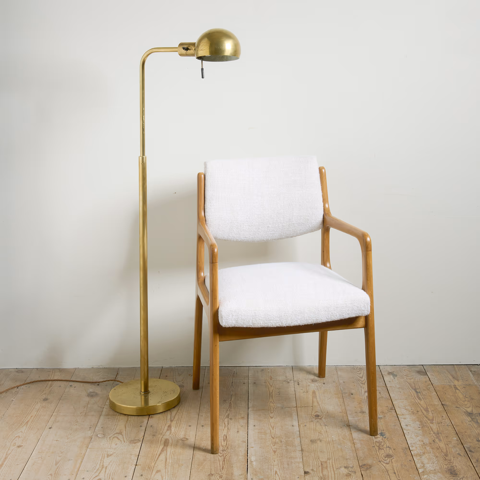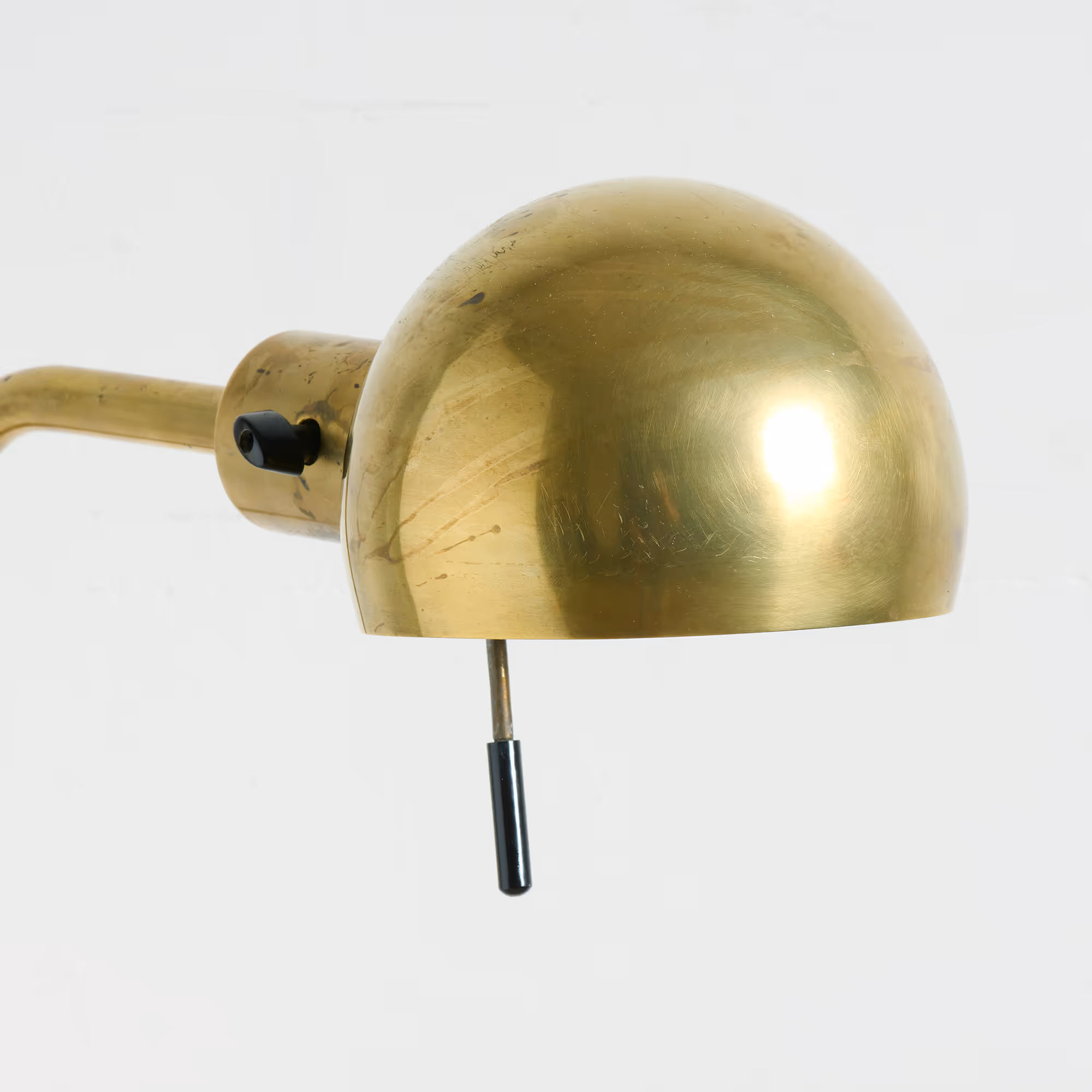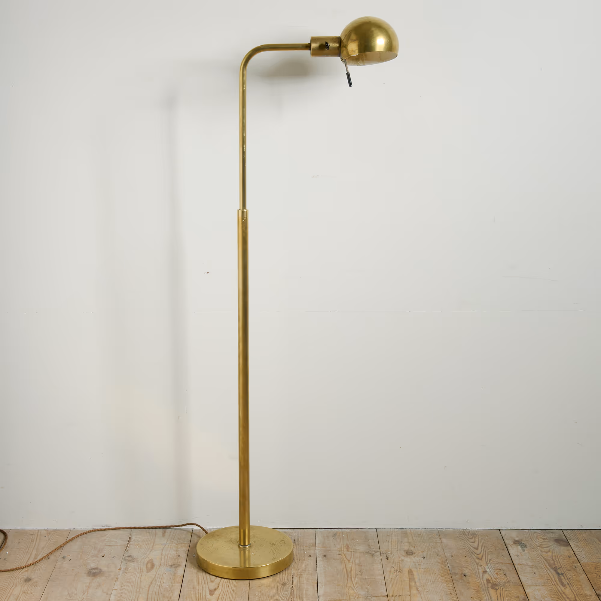 Brass reading floor lamp with round, directional shade and original twist switch. Adjustable height.