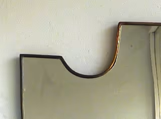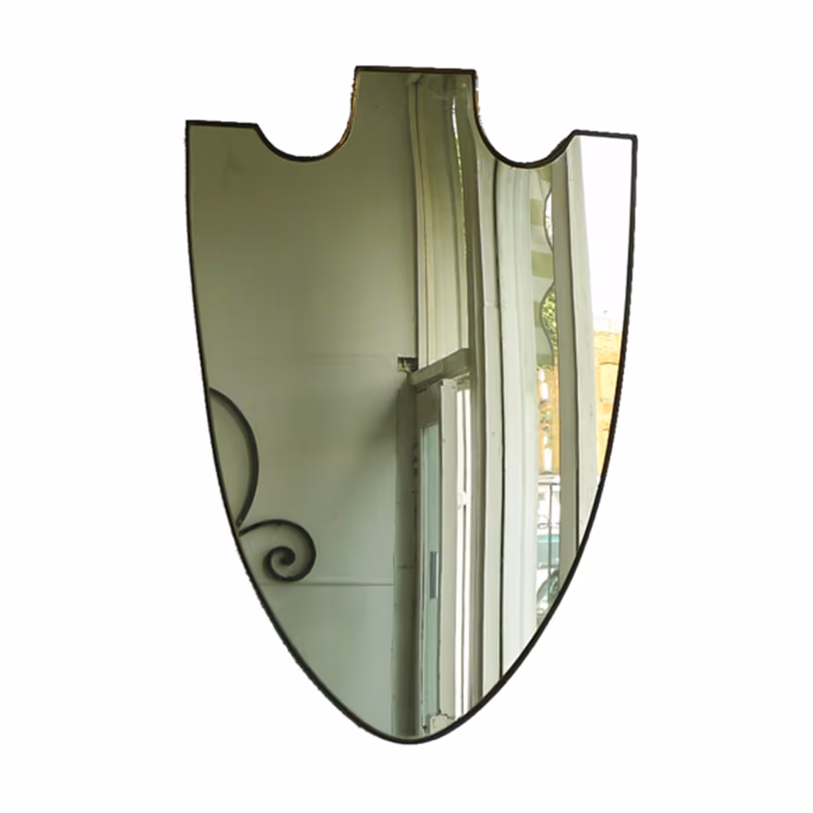 A shield-shaped mirror with thin brass frame. Original plate
