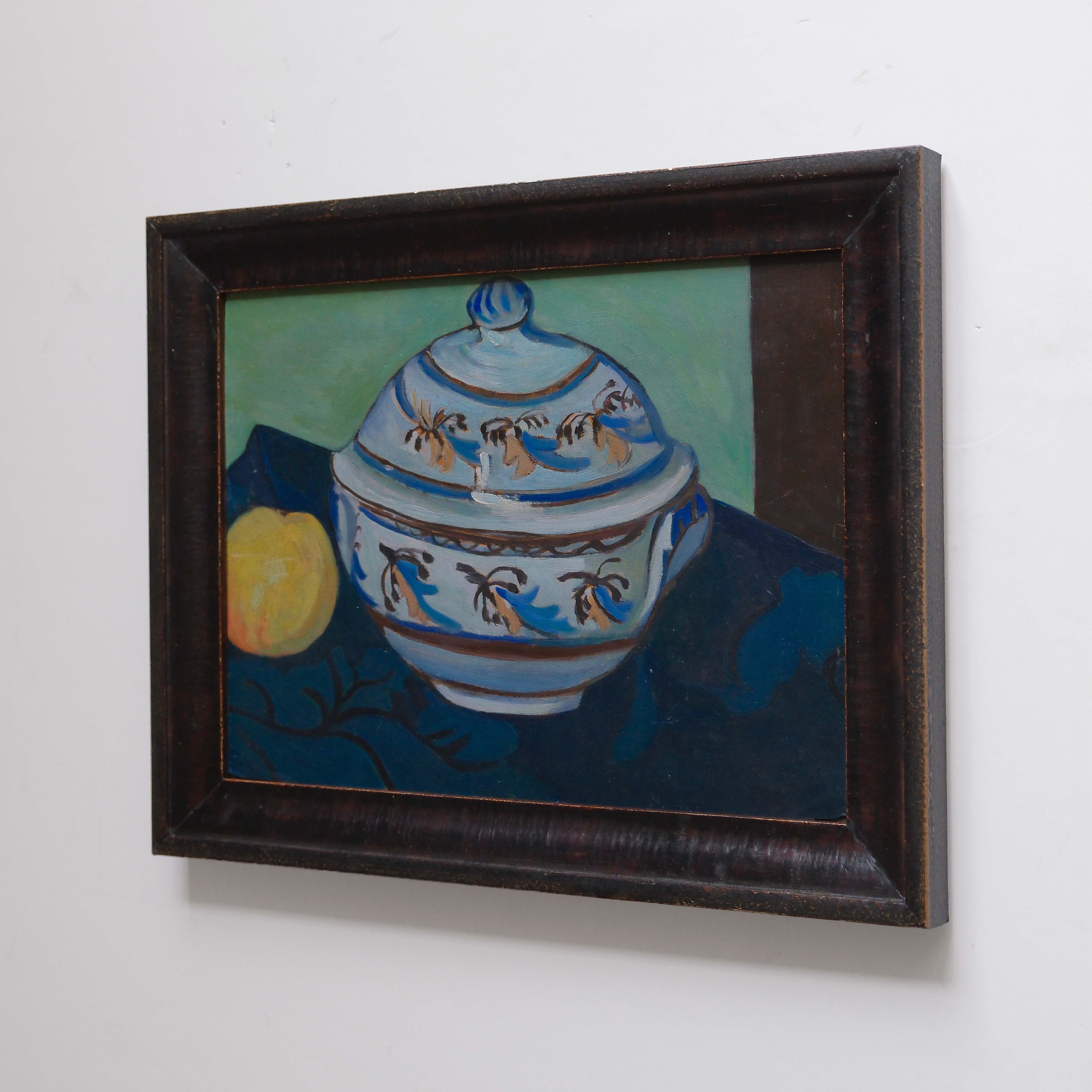 Still life from Brittany representing a decorated earthenware tureen and an apple.