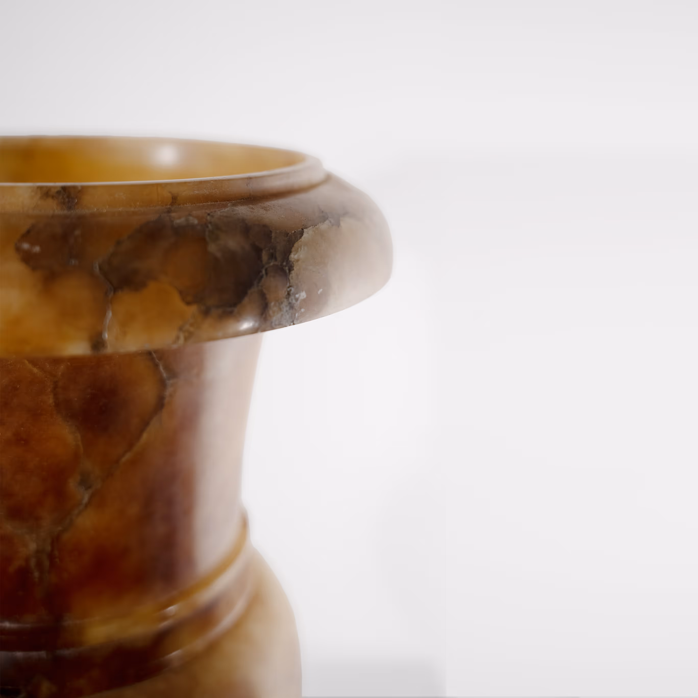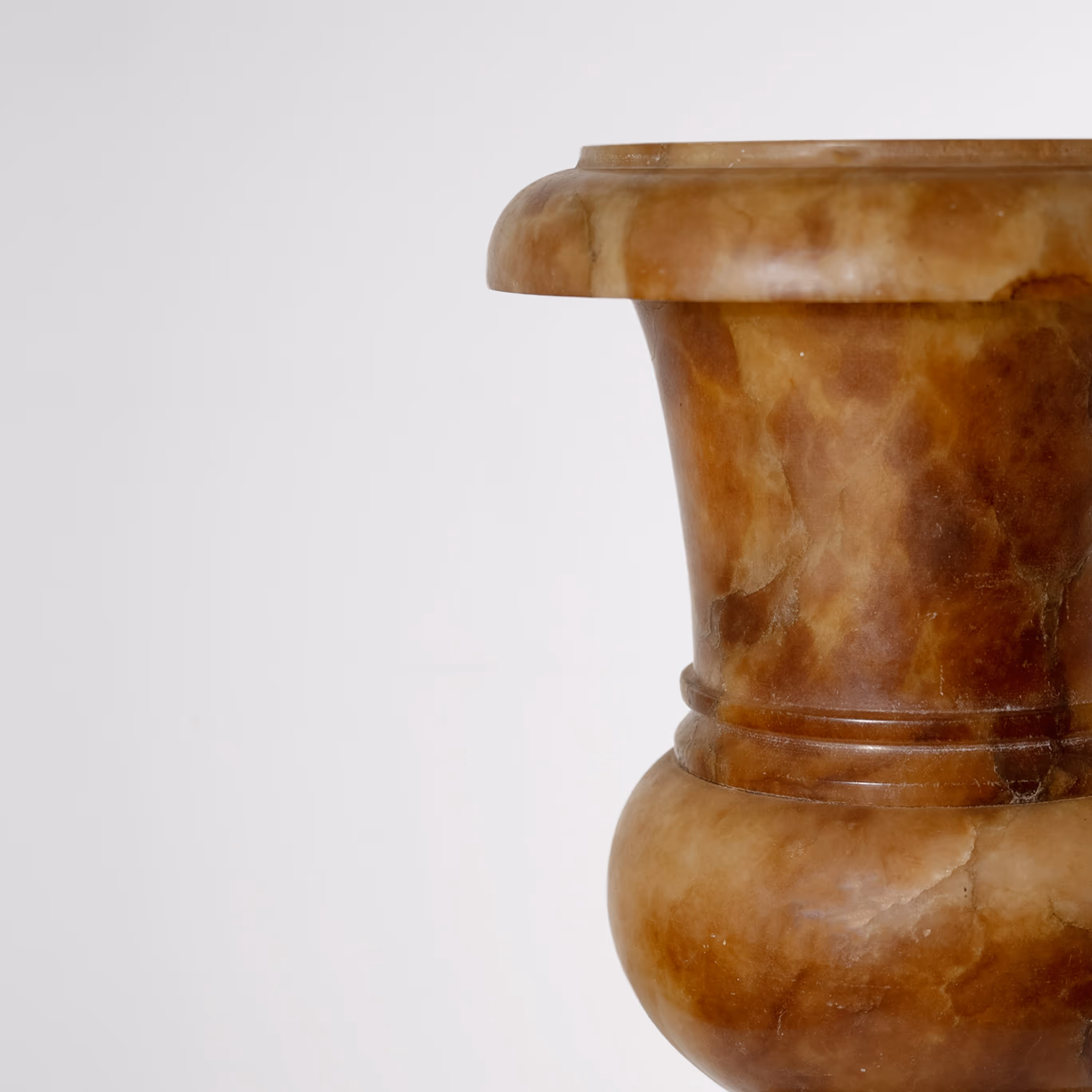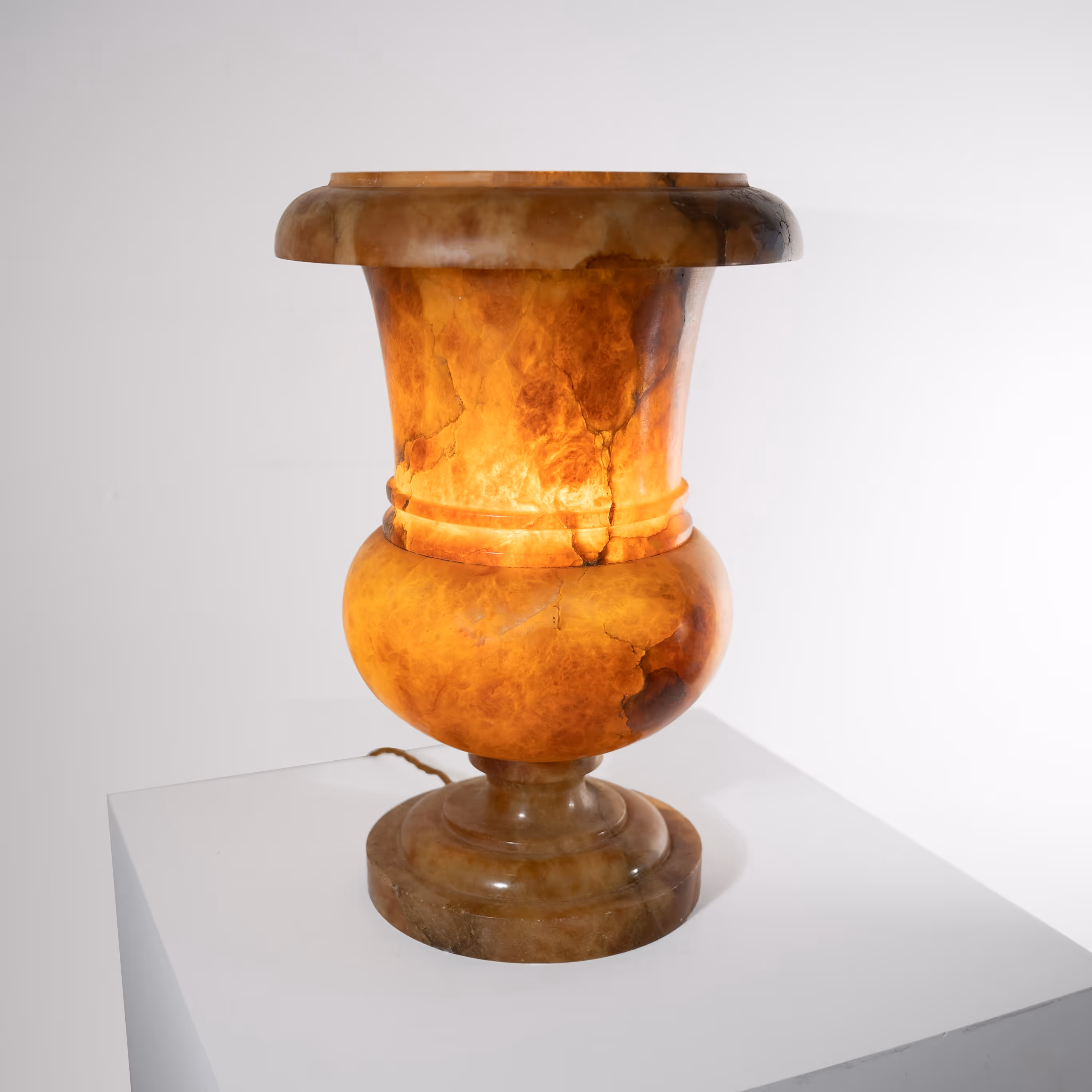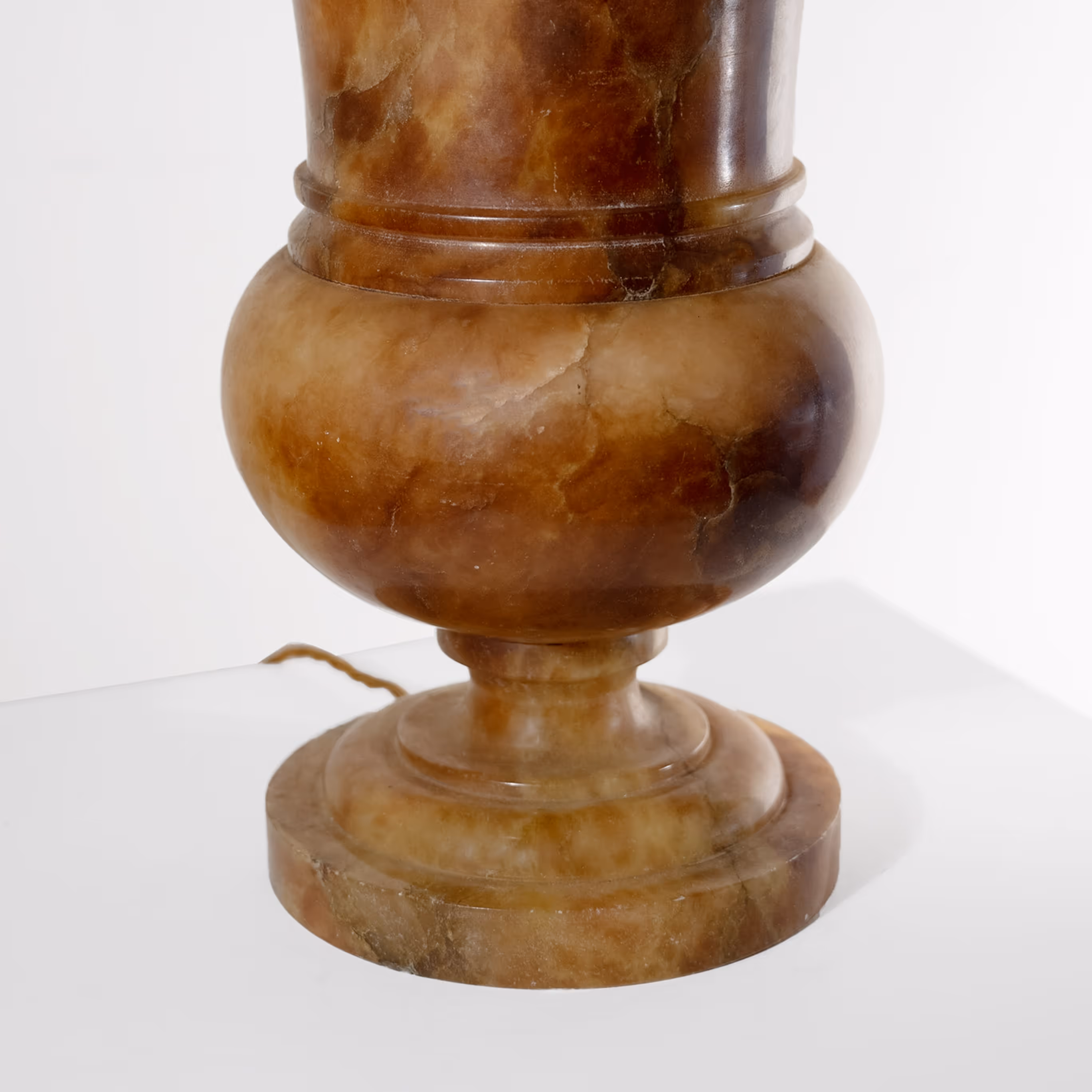 Large brown alabaster, urn-shaped table lamp. Wonderful warm glow.