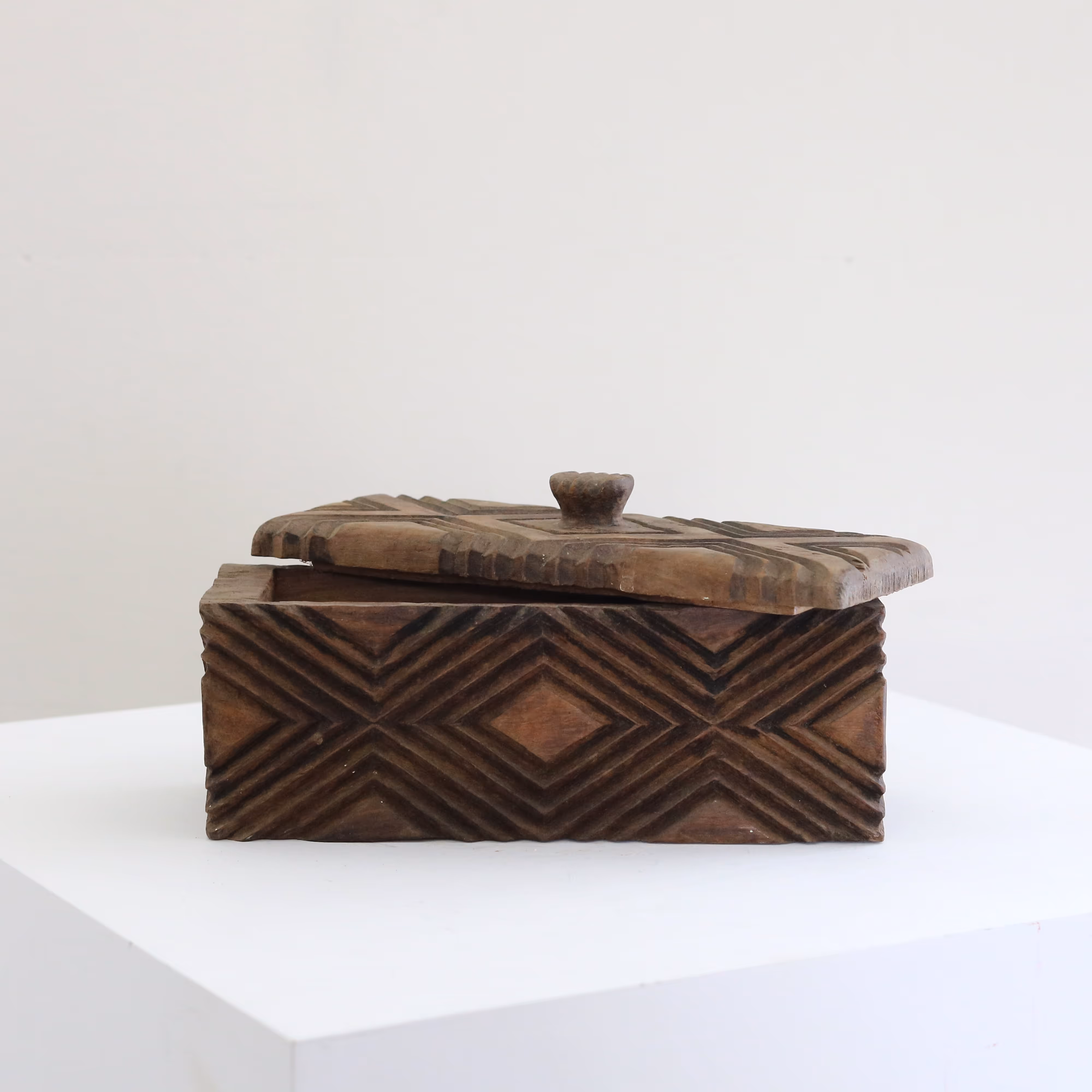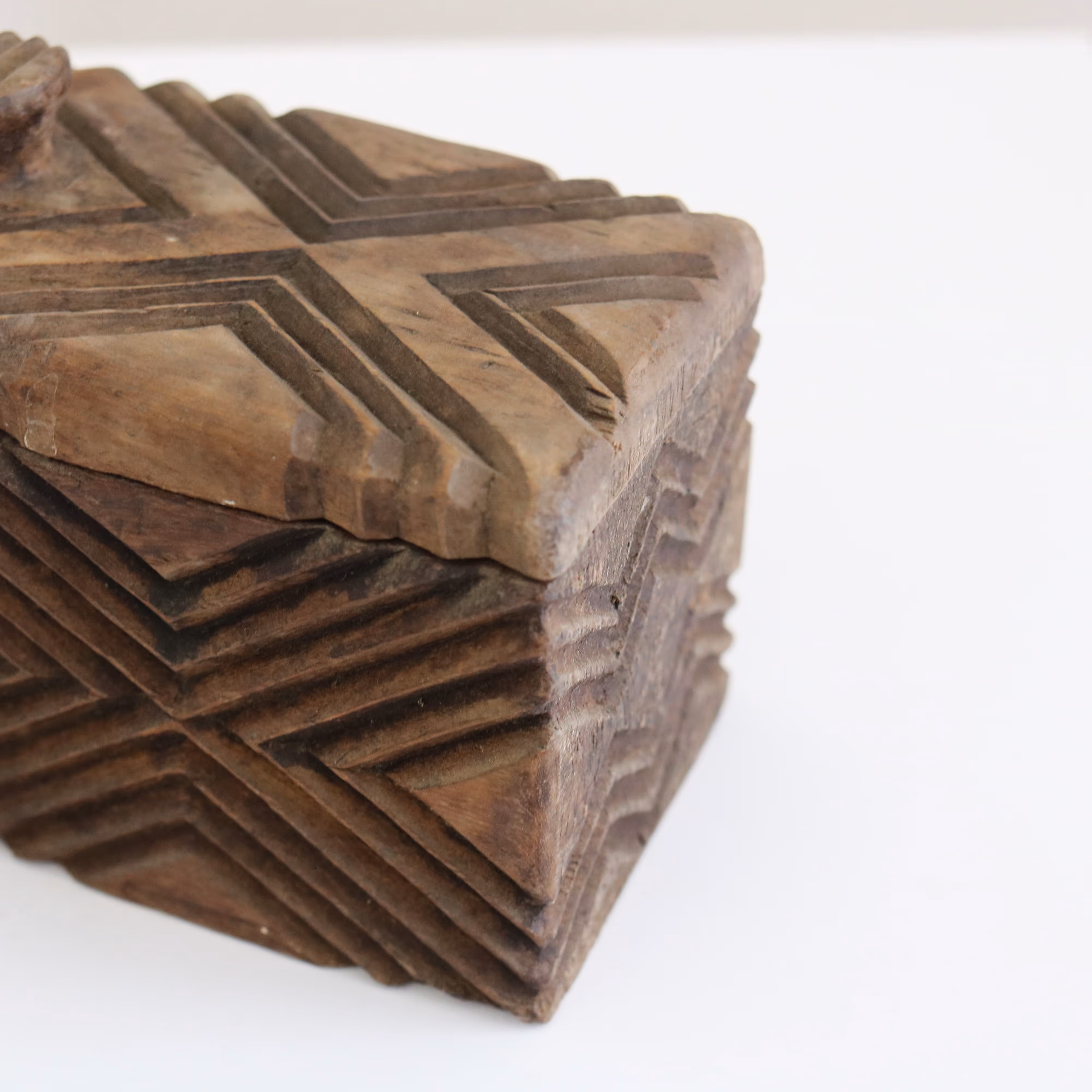 Wooden box carved with geometric incisions, reminiscent of the work of the Kuba People in Central Africa.