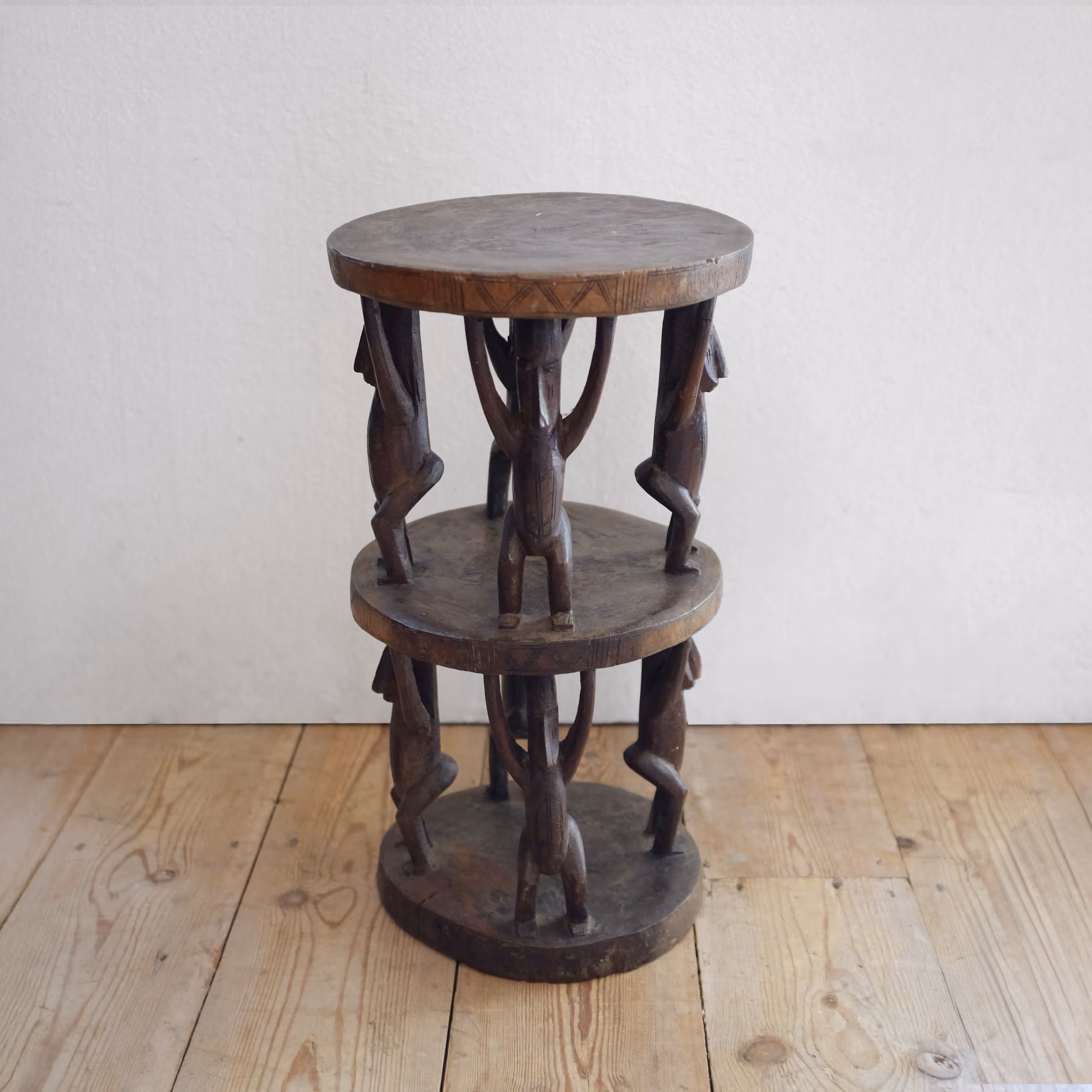 Two-tiered, monoxyle side table with carved, supporting figures.