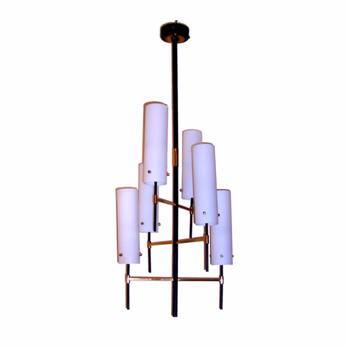 An elegant ceiling light by Stilnovo; brass & black metal frame with 6 glass shades, all in perfect condition. An interesting, asymmetrical construction.
