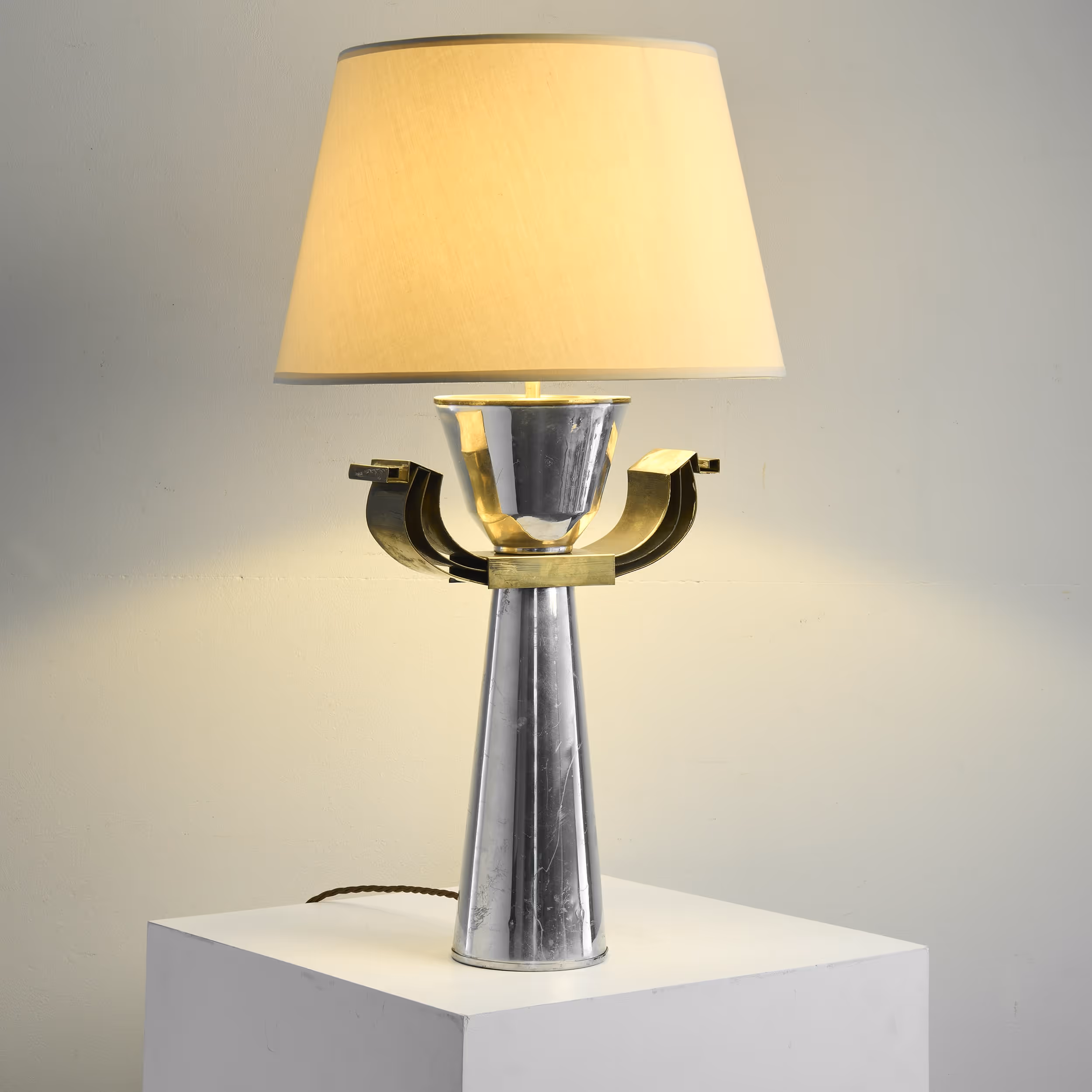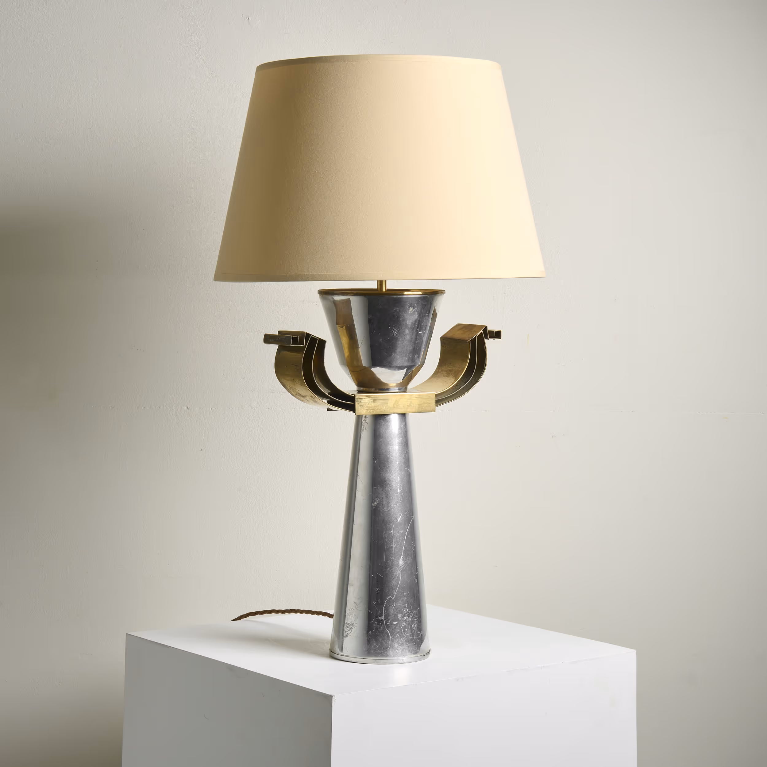 Sculptural chrome & brass table lamp with bespoke shade.