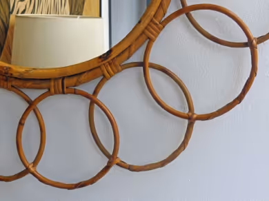 A circular bamboo mirror. The central mirror plate enclosed by sixteen interlinked circles.