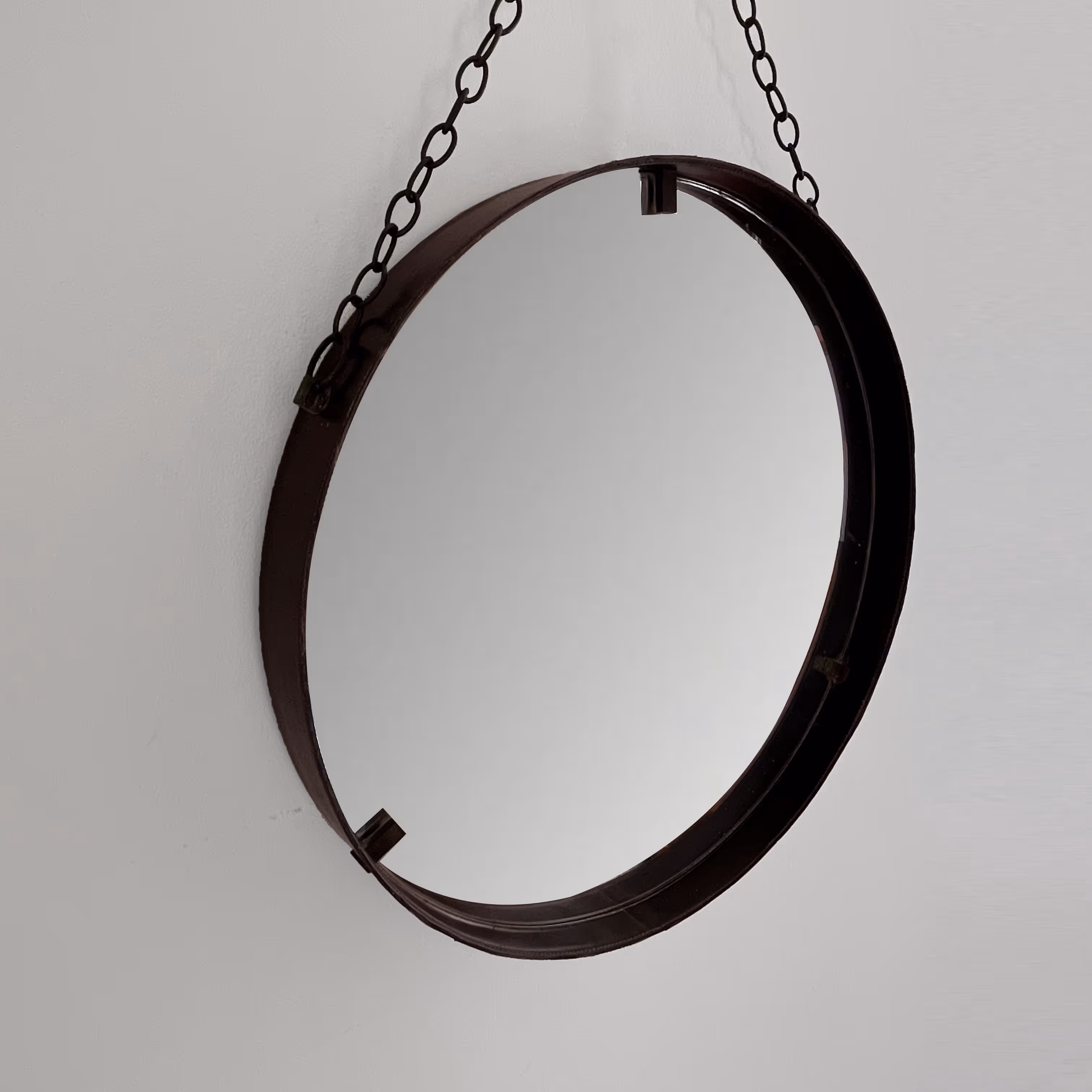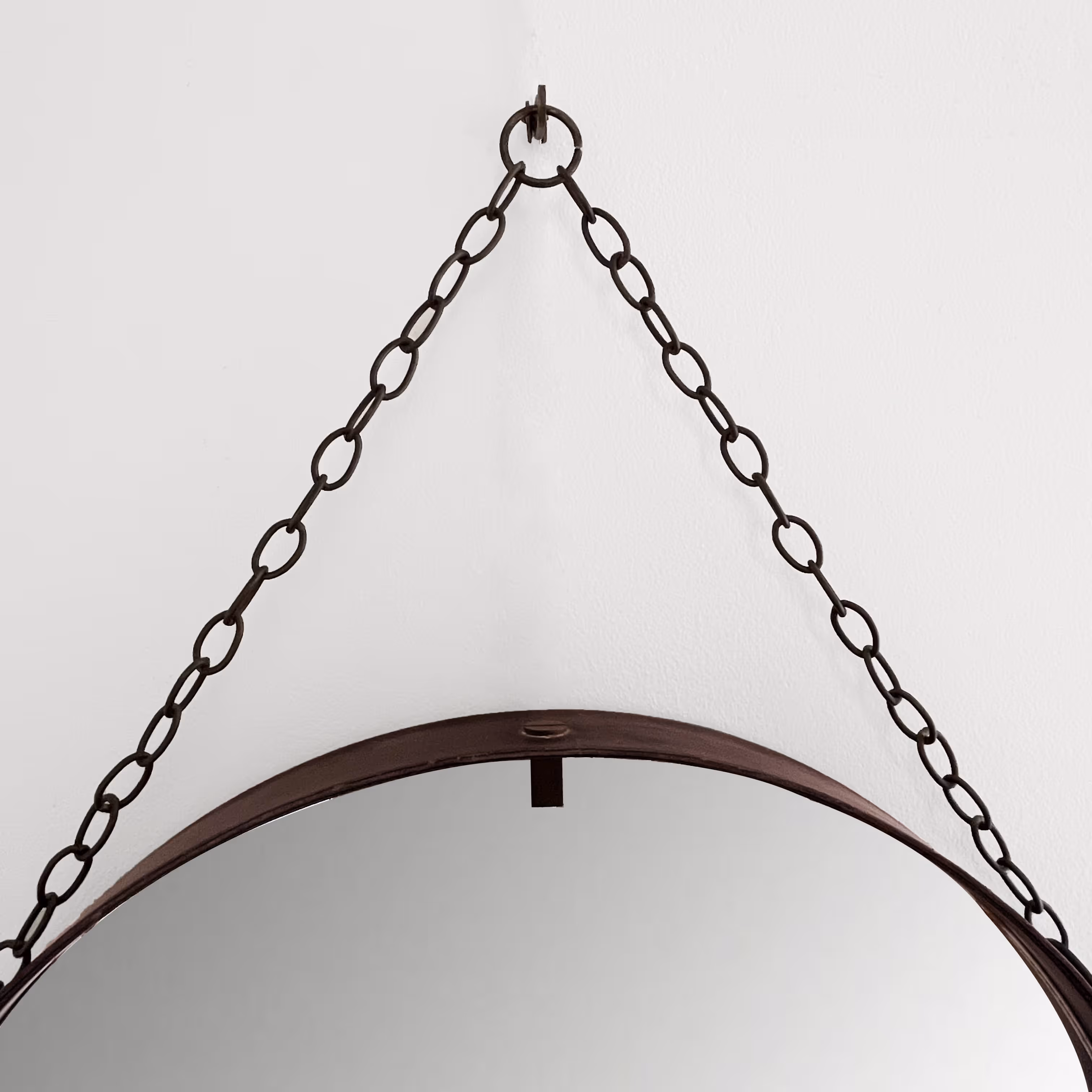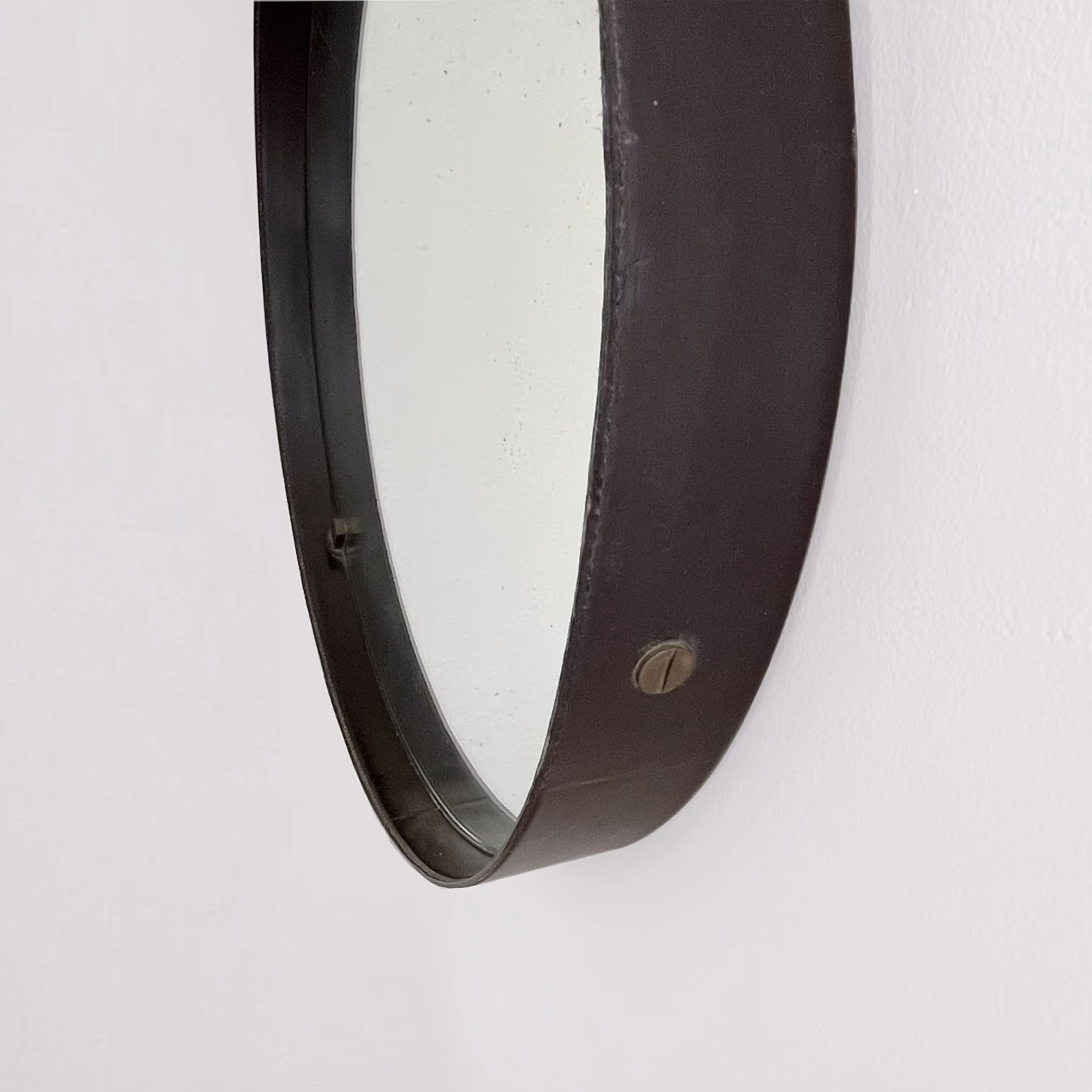 Circular mirror in stitched black leather with dark brass fittings and chain.