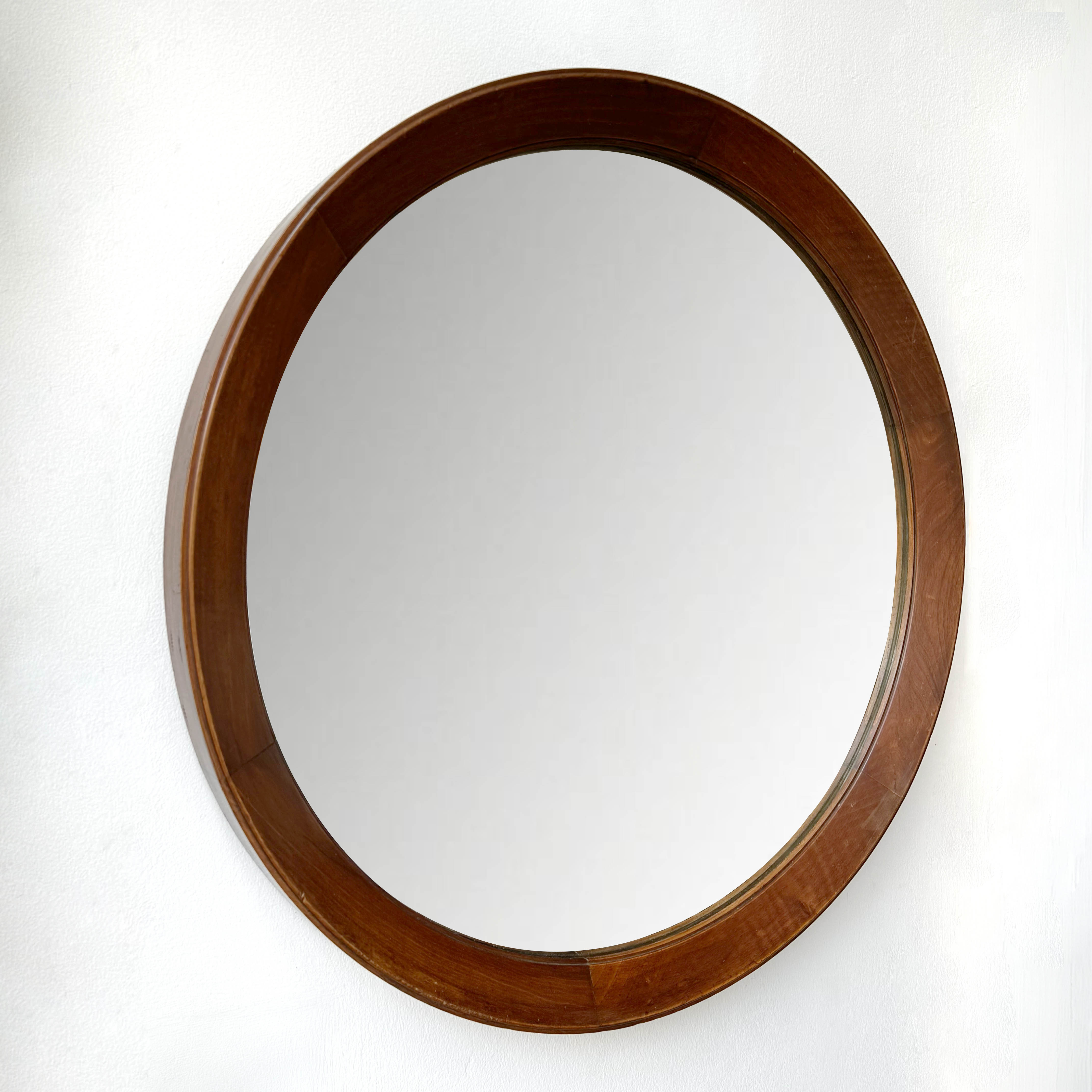 Circular mirror with fat, deep walnut frame