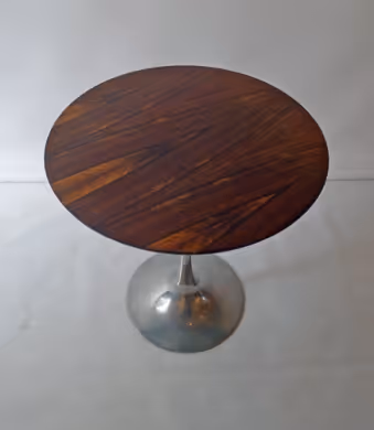 A circular rosewood side table with steel base.