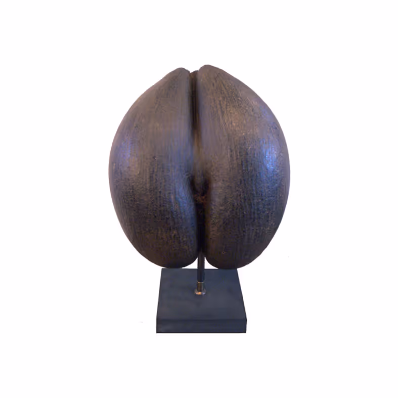 The Coco de Mer pod originates from the Seychelles where its trees are now a protected specie. Therefore the nut has always been rare and highly collectable. In centuries past the coconuts that fell from the trees and ended up in the sea would be carried away eastwards by the prevailing sea currents. The nuts can only float after the germination process, when they are hollow. In this way many drifted to the Maldives where they were gathered from the beaches and valued as an important trade and medicinal item. Legend has it that sailors who first saw the nut floating in the sea imagined that it resembled a woman's disembodied buttocks Until the true source of the nut was discovered in it was believed by many to grow on a mythical tree at the bottom of the sea. European nobles in the sixteenth century would often have the shells of these nuts polished and decorated with valuable jewels as collectibles for their private galleries. 1768, The specimen we are selling is believed to date back to the early 20th century and has been professionally mounted.